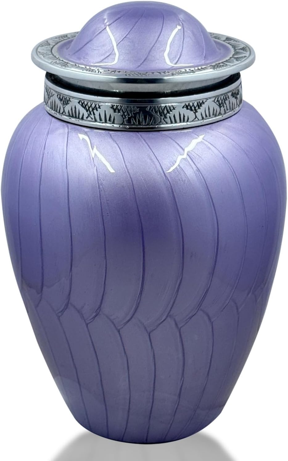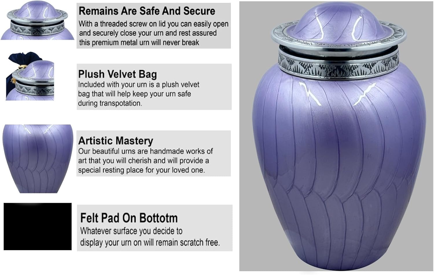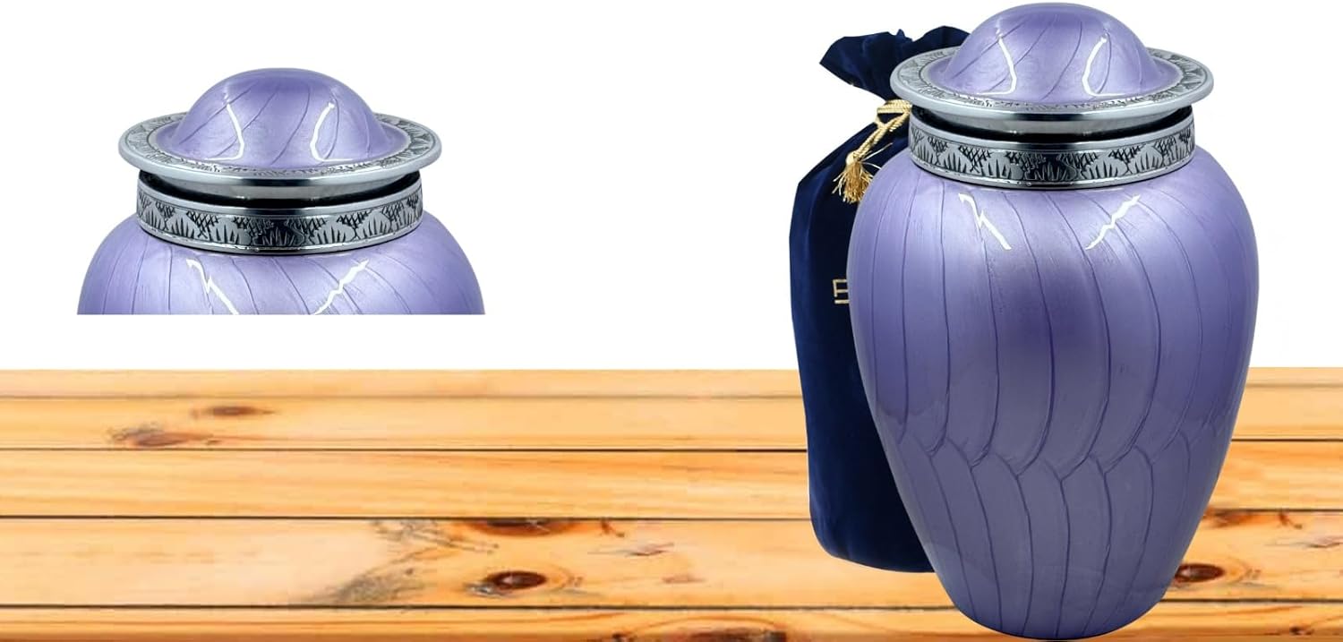 As Unique as the Lives they SymbolizeOur Cremation Urns are designed to not only provide a final resting place for your loved one forever, but serve as a beautiful work of art within your home, niche, or columbarium.Bold & Divine Cremation Urns for adult ashes is a soft and heavenly tribute for your loved one. All of our cremation urns are handmade to perfection by an ancient process called sand casting. Handcrafting provides each urn with its own unique variation in color, finish and texture -- so no two urns are exactly alike. Truly, a one-of-a-kind urn to cherish your loved one. The urn has a threaded screw-top lid for easy handling and secure display. It is ideal for home, columbarium, scattering, or burial. This cremation urn is made of solid Aluminum and is constructed to last without tarnishing. Comes with a velvet gift bag/box.FEATURES:⟐ Hand made with extreme detail.⟐ Threaded lid.⟐ Each cremation urn includes a velvet gift bag or box.⟐ Felt bottom to protect your furnishings from scratches.