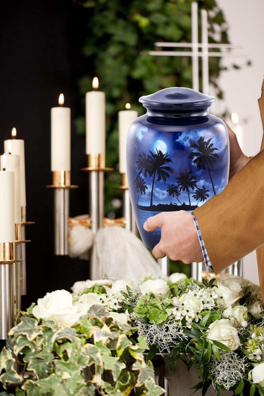 Affordable Alloy Adult Size Hand painted Midnight Beach Urn Cremation Urn for Ashes with High Gloss Coating. This is a very comforting and thoughtful way to celebrate and remember the wonderful life your loved ones had lived. You will feel very peaceful as your loved ones remains rest in this beautiful urn. A threaded lid enables ashes to be placed inside the urn and securely sealed and closed. The bottom of the urn is felted to protect your furniture.