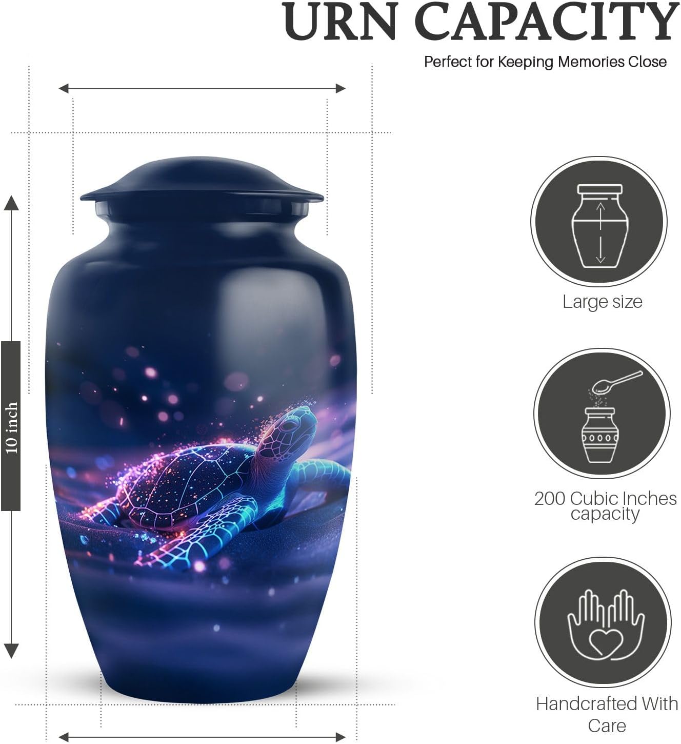 This turtle cremation urn is a peaceful and tribute for someone who moved through life with quiet strength, patience, and grace. Designed at 10 inches tall with a generous capacity of 200 cubic inches, it is perfectly suited to hold the ashes of an adult, whether you are looking for an urn for ashes adult male or urn for ashes for women. The beautifully crafted turtle design symbolizes longevity, wisdom, and a steady, meaningful journey, making it a fitting memorial for a loved one who lived life with depth and intention. This cremation urn offers a combination of emotional warmth and practical reliability, featuring a threaded screw-top lid that ensures the ashes remain secure over time. Whether displayed at home as a decorative urn, placed in a niche, or used as a burial urn in ground, it provides comfort and presence in any memorial setting. Families searching for cremation urns for human ashes, urns for ashes for mom, or adult size cremation urns for dad will find this turtle design especially meaningful. It’s a thoughtful option for those seeking urns for ashes adult female, urns for ashes for men, or anyone who appreciated the natural world and the symbolic beauty of the turtle. This urn is also ideal for those in need of funeral urns, cremation urns for adult ashes, or memorial urns for human ashes that express a sense of calm and connection. Its detailed and graceful appearance appeals to individuals looking for decorative urns for home decor or meaningful urns for ashes that reflect a loved one’s values. Whether a parent, grandparent, spouse, or friend, this adult urn serves as a lasting symbol of the peaceful life they led and the memories they leave behind. Suitable for both men and women, this cremation urn brings purpose and elegance together, offering a heartfelt place of rest.
