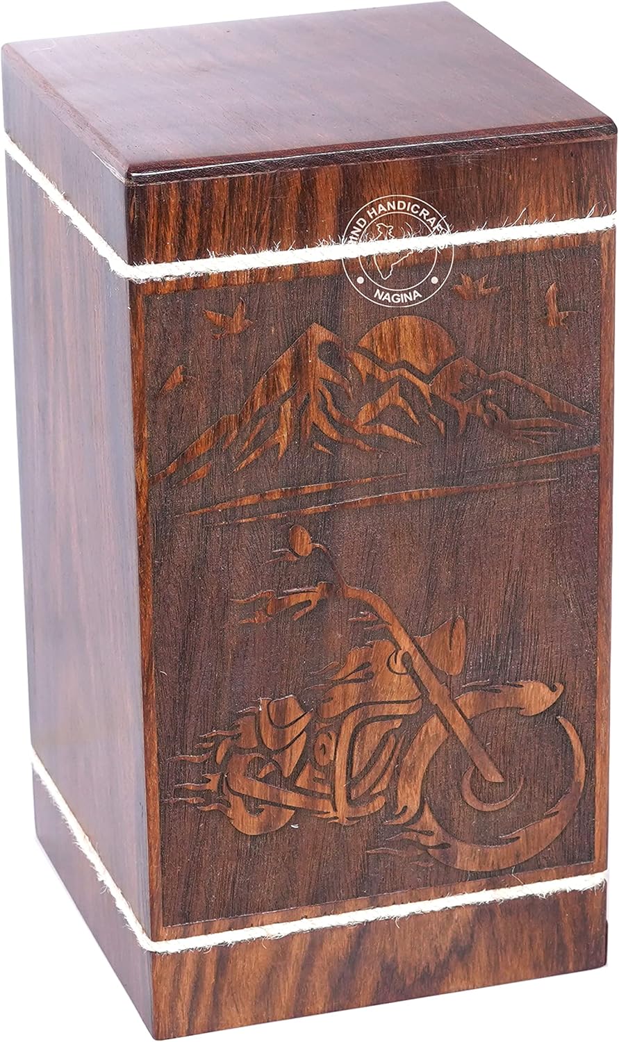 Celebrate the adventurous spirit of your loved one with the CRY HIND HANDICRAFTS Biker Wooden Cremation Urn for Human Ashes. This handcrafted memorial urn combines durability, artistry, and symbolism in a unique design that reflects freedom and the open road.Crafted from high-quality hardwood, this urn features an intricately engraved motorcycle riding beneath a serene mountain sunrise — a powerful tribute to bikers, travelers, and nature enthusiasts. The natural wood grain finish, complemented by rustic jute rope detailing, adds a warm, earthy touch that blends beautifully with home décor, columbarium niches, or burial memorials.With a 250 cubic inch capacity, this urn securely holds the ashes of an individual weighing up to 250 lbs. The bottom panel is tightly sealed with screws, ensuring the contents remain safe and undisturbed.Whether displayed as a cherished keepsake or chosen for a respectful burial, this urn offers a lasting tribute to those who embraced the road, adventure, and freedom.Key Features:✔️ Engraved motorcycle and mountain design for bikers and outdoor enthusiasts✔️ Durable hardwood construction with a natural wood grain finish✔️ Secure bottom panel with screws for added protection✔️ Ideal for home display, columbarium placement, or burial✔️ Thoughtful memorial gift for bikers, adventurers, and free spiritsHonor their journey with a beautifully crafted urn that tells their story — a meaningful keepsake for generations to come.