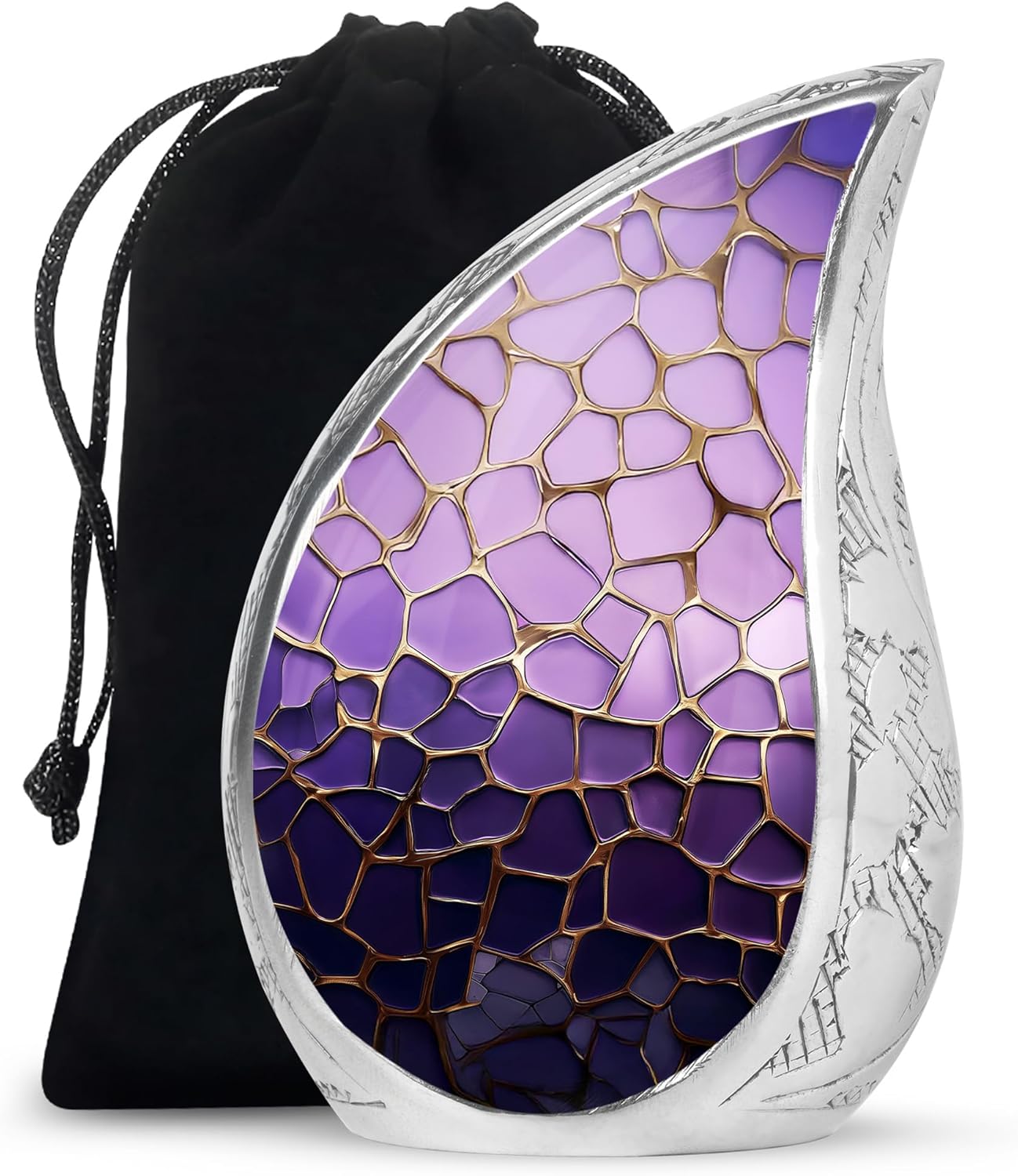 This purple-themed burial urn for ashes adult male is a graceful tribute designed to reflect peace, elegance, and eternal remembrance. The handmade decorative urn features a stunning blend of deep purple tones, soft violet clouds, and golden accents that create a dreamy, celestial atmosphere. The imagery includes a purple sky flowing into a serene river, surrounded by cloud patterns that evoke a sense of calm and spiritual beauty. Ideal for honoring a loved one with a deep appreciation for art, tranquility, or the color purple, this unique urn for ashes for mom and dad offers both emotional comfort and visual elegance. Made with lasting materials, it is suitable for display at home decor or in a memorial gifts setting. The rich palette symbolizes dignity, love, and devotion, making this memorial urns for human ashes adult female and male a meaningful resting place. Whether chosen for personal use or as a thoughtful cremation gift, it represents both beauty and heartfelt memory. Available in various sizes, it allows families to share human adult ashes or preserve them in one centerpiece of remembrance.