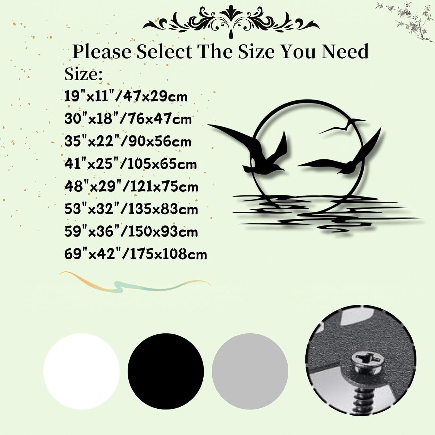 Seagulls Wall Art, Metal Sunset Decor, Inner Peace Decor Art, Home Decor, Bird Metal Wall Art, Metal Wall Decor for Living Room 1.Enhance the natural ambience of your home with this stunning sunrise and birds metal wall art. Enhance your decor with this beautiful piece that captures the beauty of nature in a timeless and elegant way 2.This product is made of high-quality metal materials and has undergone rigorous quality and durability testing to ensure that it is not easily broken or deformed. Electrostatic matte paint finish protects artwork from rust, fading and corrosion 3.The intricate design of seagulls soaring against a vibrant sunrise creates a captivating 3D shadow effect that is sure to be the talk of any room 4.This sunrise metal wall art is the perfect addition to any home decor, whether in your living room, bedroom, or even on your patio 5.It also makes a thoughtful housewarming gift for a friend or family member who appreciates unique and elegant pieces,Bring a natural touch to your living space Sunrise and Birds Metal Wall Art Size: 19"x11"/47x29cm 30"x18"/76x47cm 35"x22"/90x56cm 41"x25"/105x65cm 48"x29"/121x75cm 53"x32"/135x83cm 59"x36"/150x93cm 69"x42"/175x108cm Material: wrought iron Color: black silver white Quantity: 1 piece Note: 1. Due to different screen displays, there may be slight differences in colors 2. Products are measured by hand, please allow 1-3% size difference, please make sure you don't mind before bidding