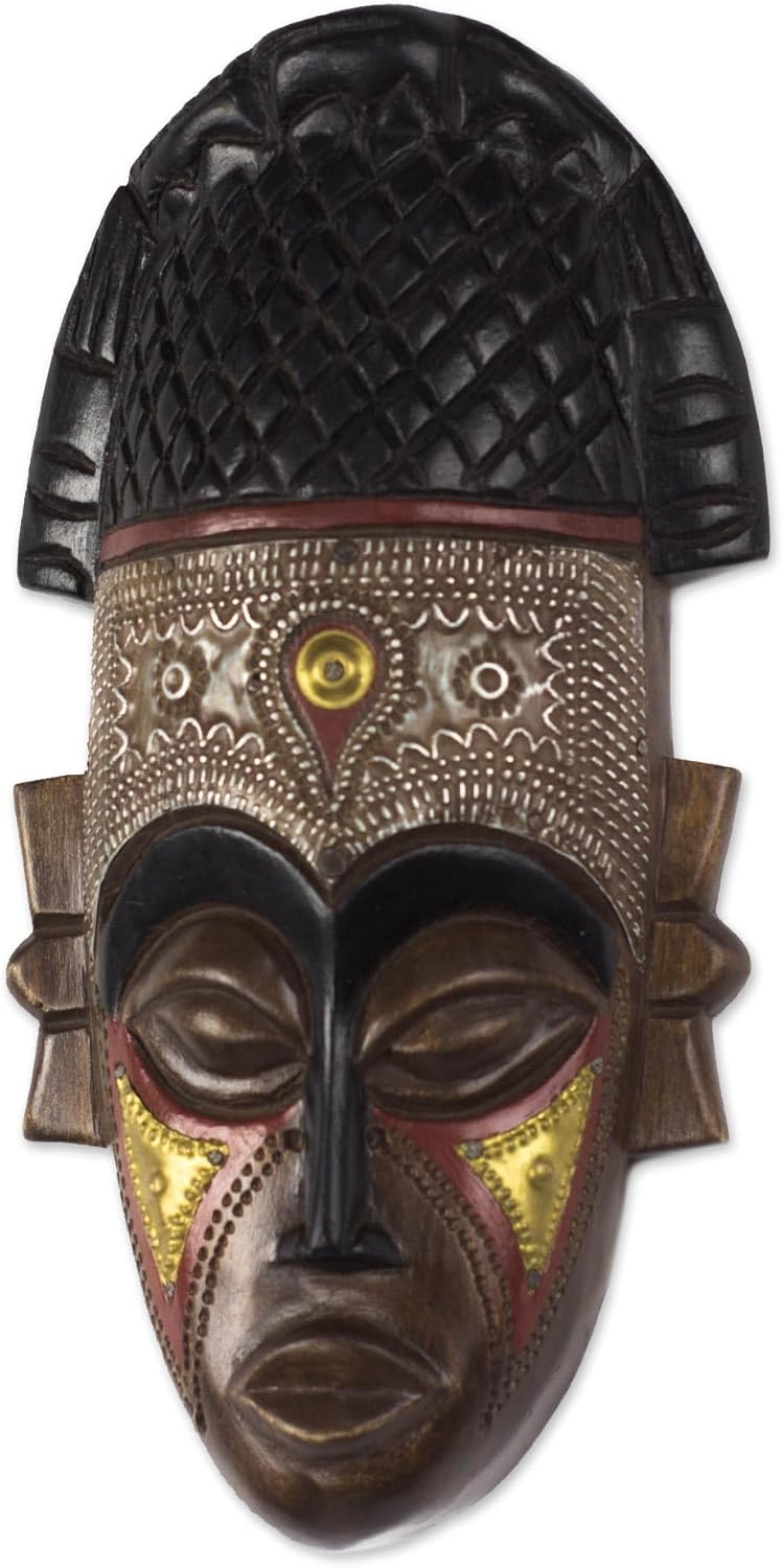 Novica works together with talented artists, artisans, and designers around the world to produce stunning, keepsake handmade treasures.About this item: Wearing a lovely crown, this African mask is hand-carved from sese wood. Ghanaian artisan Victor Dushie accentuates the mask with sections of embossed aluminum and brass that evoke traditional scarification practices.Hand-crafted item -- color, size and/or motif may vary slightlyIntended as wall decorAbout our Artist: My name is Victor Dushie and I was born in Accra. I grew up in a community of wood carvers and designers, which naturally made me interested in it. During this time, I learned to master the craft after a lot of practical experience. I find that sanding down the wood has been the main challenge of this art. After completing my training, I also taught two others who actively use their skills. My creations are made from sese wood, which is readily available in my local markets. I am inspired by the Bible as well as other artists. My favorite part about this craft is designing.My family works alongside me, helping me sand down my creations before I put the finishing touches on them.