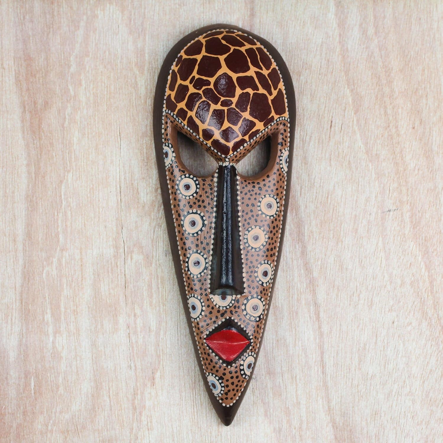 Handcrafted of sees wood, this tall, pointed mask brings the spirit of African wildlife wherever it goes. Ghanaian artisan K. Baka creates the mask, painting it with dot motifs at the face and giraffe spots at the forehead.