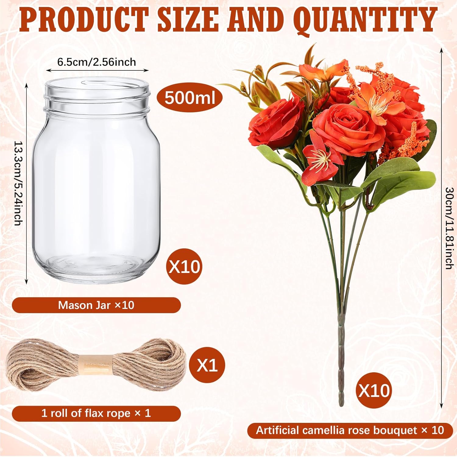 Features: These mason jars table ornaments look warm and sweet, and are very suitable for taking photos with family members, adding a lot of charm to the photos. These table flowers centerpieces are available in 2 styles, you can combine them for decoration according to your needs, enjoy the fun of DIY. Specifications: Main material: glass, flax Color: Artificial camellia rose: coffee color Size: Jar: 3.15 x 5.24 inches/ 8 x 13.3 cm in bottom diameter and height Jar capacity: 17 oz/ 500 ml Rope length: about 33 ft/ 10 m Package includes: 10 x Glass mason jars 1 Roll flax rope 10 x Artificial camellia roses Notes: Manual measurement, please allow slight errors on size. The color may exist a slight difference due to different screen displays. Winding risk may exist, please keep our product away from children. Glass products, please handle with care.