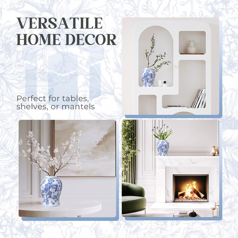 | Recommended Uses For Product | Elevate your space with this hand-painted blue and white porcelain vase. Adorned with blooming plum blossoms and golden accents, it stands as a timeless decorative piece or an elegant vessel for displaying dried flowers. |
