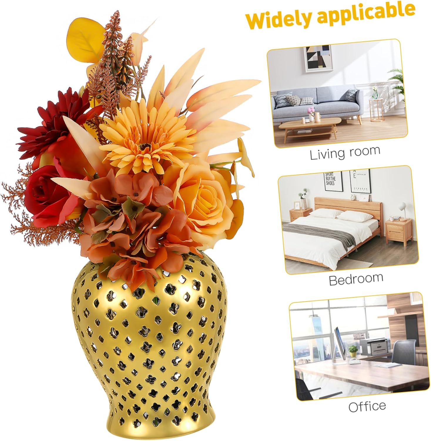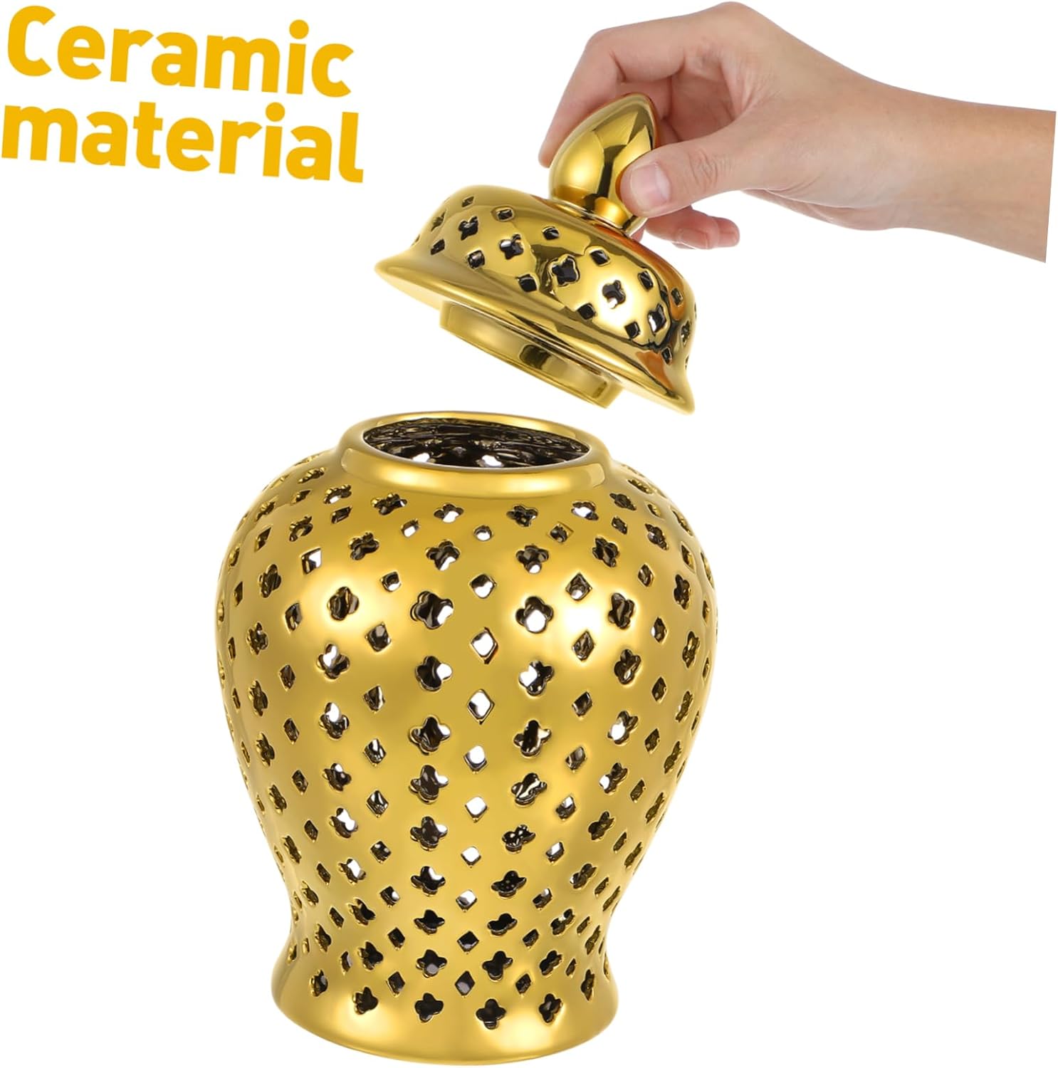 Package Include 1 x Hollow Out Jar Features -Product Info:Golden ceramic general jar - Color: Golden decorative jars for living room - Size: 28.00X15.00X15.00cm/11.00X5.89X5.89in traditional home decor -Material:Ceramic ginger vase - Simple design with great craftsmanship is attractive and fashionable, attracting other's attention decorative porcelain jar. - A perfect way to display your favorite plants and flower for household balcony garlic jar. - Made of stable ceramic material, solid and odorless, the flower Vase is not easy to break or deform porcelain jar with lid. - Can be used as plant Vase, storage container, home decoration, party decoration, wedding ceremony ornament living room vase. - The flower Vase is a perfect those who love plants for European style special design and workmanship home decoration.Goods Informationliving room decor This is a hollow jar, ideally designed for decorating garden balcony, and wedding ceremonies.temple jars for home decor The style of the flower arrangement can go well with many plant styles, which is perfect for planting many kinds of flowers or other decorative plants, practical and