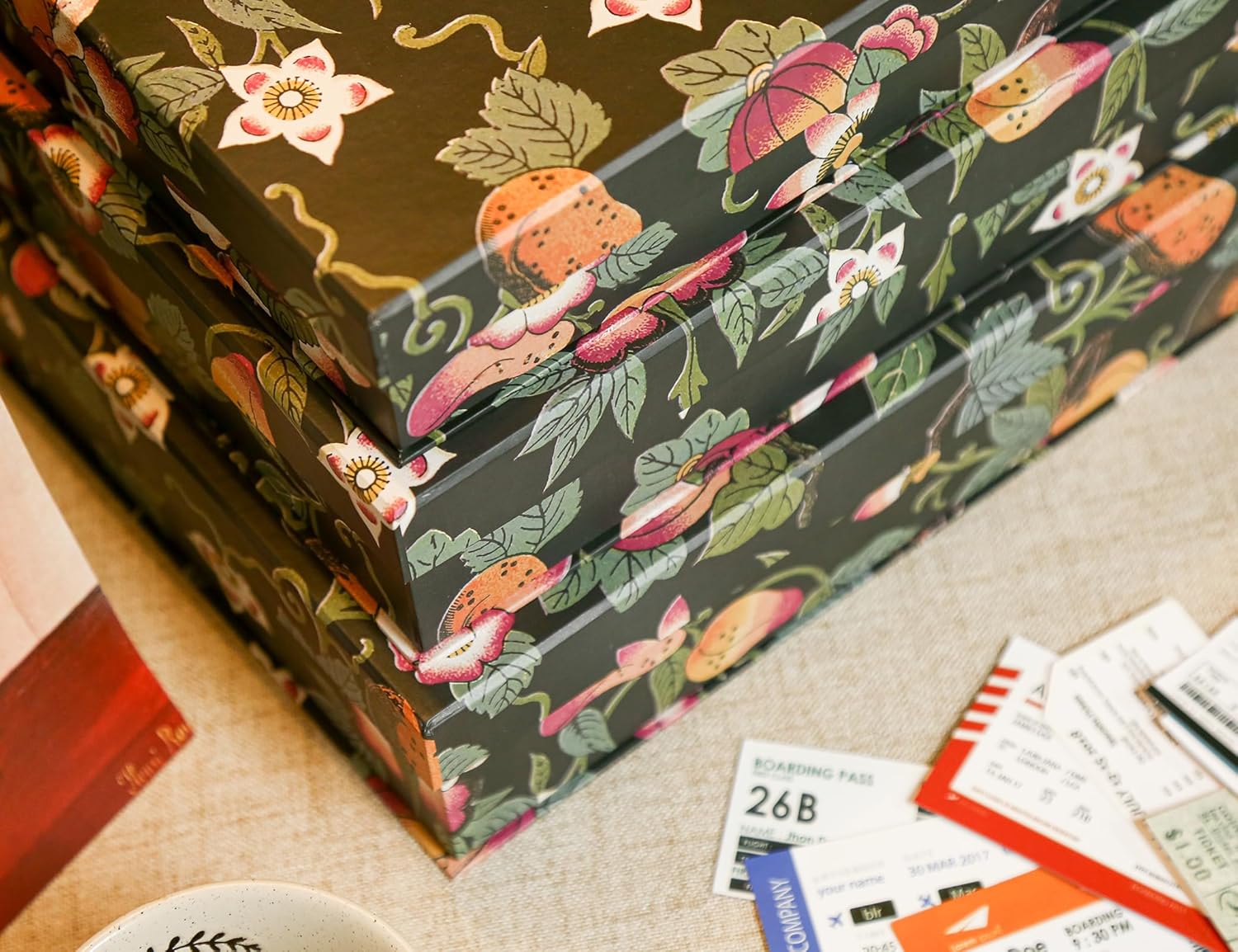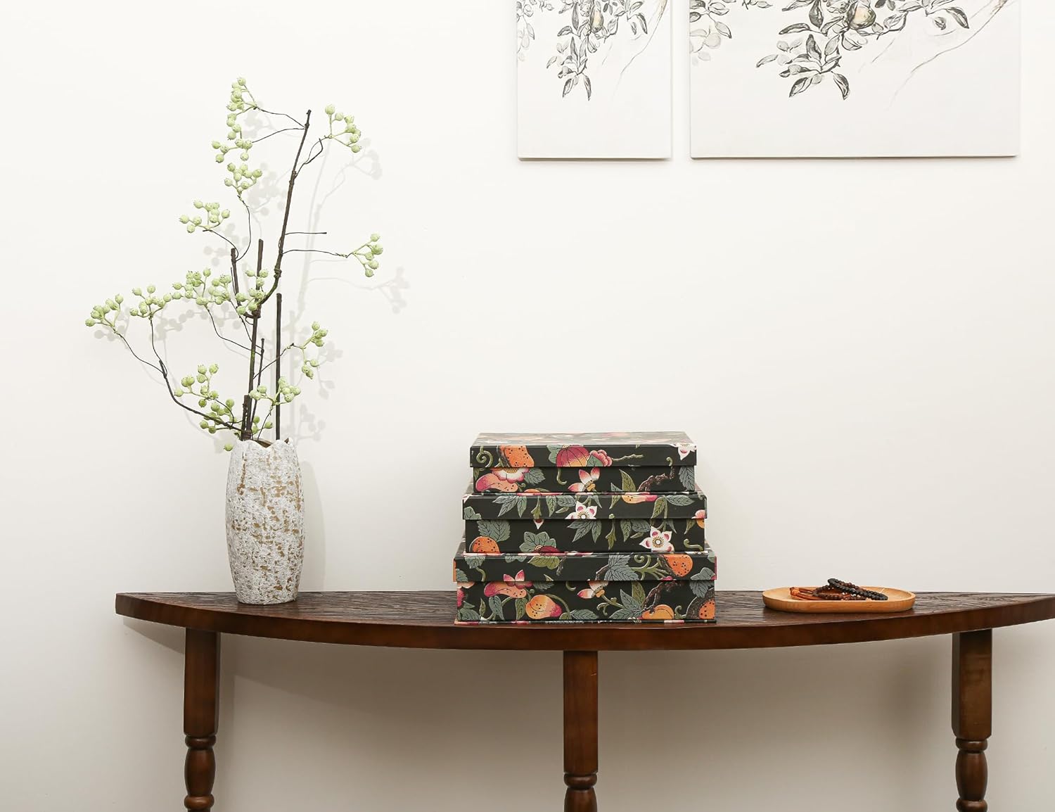 Add warmth, character, and artistry to your home with this 3-piece decorative storage box set, designed to be both functional and visually striking. The dark botanical pattern features a thoughtful mix of flowers, leaves, and fruit illustrations, layered in rich, earthy tones that stand out beautifully against the deep background. Crafted from sturdy cardboard paperboard, these boxes are ideal for organizing keepsakes such as photographs, letters, small accessories, and seasonal décor. Their structured shape ensures a polished appearance, while the lightweight design makes them easy to rearrange and style throughout your home. With three graduated sizes, the boxes can be stacked to create a layered decorative look or nested together when not in use. Whether placed on a bookshelf, sideboard, or coffee table, this set transforms everyday storage into a purposeful part of your home décor.