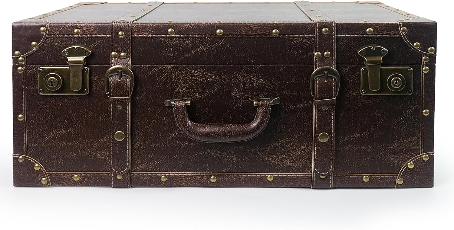 DreamsEden Wooden Vintage Suitcase, Extra Large Decorative Suitcase Box with Straps, Portable Storage Chest Treasure Keepsake BoxEnhance the elegance of your home with this antique wooden storage suitcase, decorative with faux leather straps and a classic brown finish, adding rustic charm to any room with a blend of style and function.XL handheld suitcase box measuring 23.62’’L x 14.37’’W x 9.64’’H, offer spacious capacity for home storage, convenient storage keepsake trunk comes with a carry handle grip on the top, offering the possibility of mobile storage with both versatility and decorative functionality, serving as a prop to reflect the elegance of your interior such as a desk cabinet shelf, while providing large space for storing your everyday items.Made of solid wood and faux leather, decorative with metal hardware and leather straps on side, the X-Large retro suitcases add a unique vintage design element while retaining a classic look. Perfect for elevating parties, weddings and photo shoots, these vintage suitcases combine practicality with its elegant appeal. Practical gift for housewarming, promotion, birthday, Christmas, New Year, Father's Day, Mother's Day, Anniversary, and other holidays.Note: Simple latch lock closure, keys & slot for decoration only