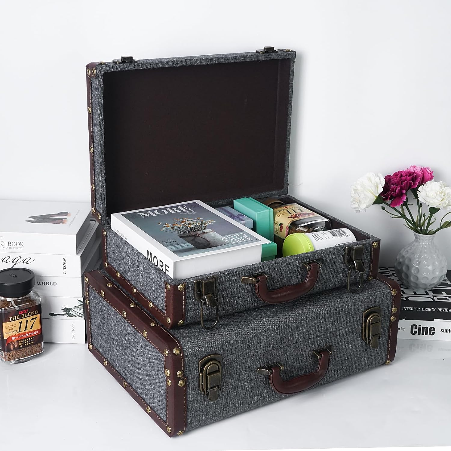 DreamsEden Wooden Suitcase Decorative Storage Box with Handle, Wood Leather Treasure Chest Trunk Keepsake Vintage SuitcaseHigh quality wooden vintage suitcases. Each wooden trunk is covered with beautiful sackcloth fabric, sturdy handles, stitched faux leather on edge and vintage metal hardware accessories that give the wood trunk a unique look. Eye catching decorative organizer with classic suitcase design adds a vintage touch to your home decor.The large capacity box adds extra storage space to your room and helps you keep things tidy.Display Size - Large : 16 x 12 x 5.7 inch - Medium : 14 x 10 x 4.7 inchInterior Size - Large : 15 x 11 x 3.4 inch - Medium : 13 x 9 x 2.3 inchWide interior space, multi-functional suitcase organizer can be used to store business cards, receipts, photos, postcards, souvenirs, bed linens, jewelry, clothes and more.