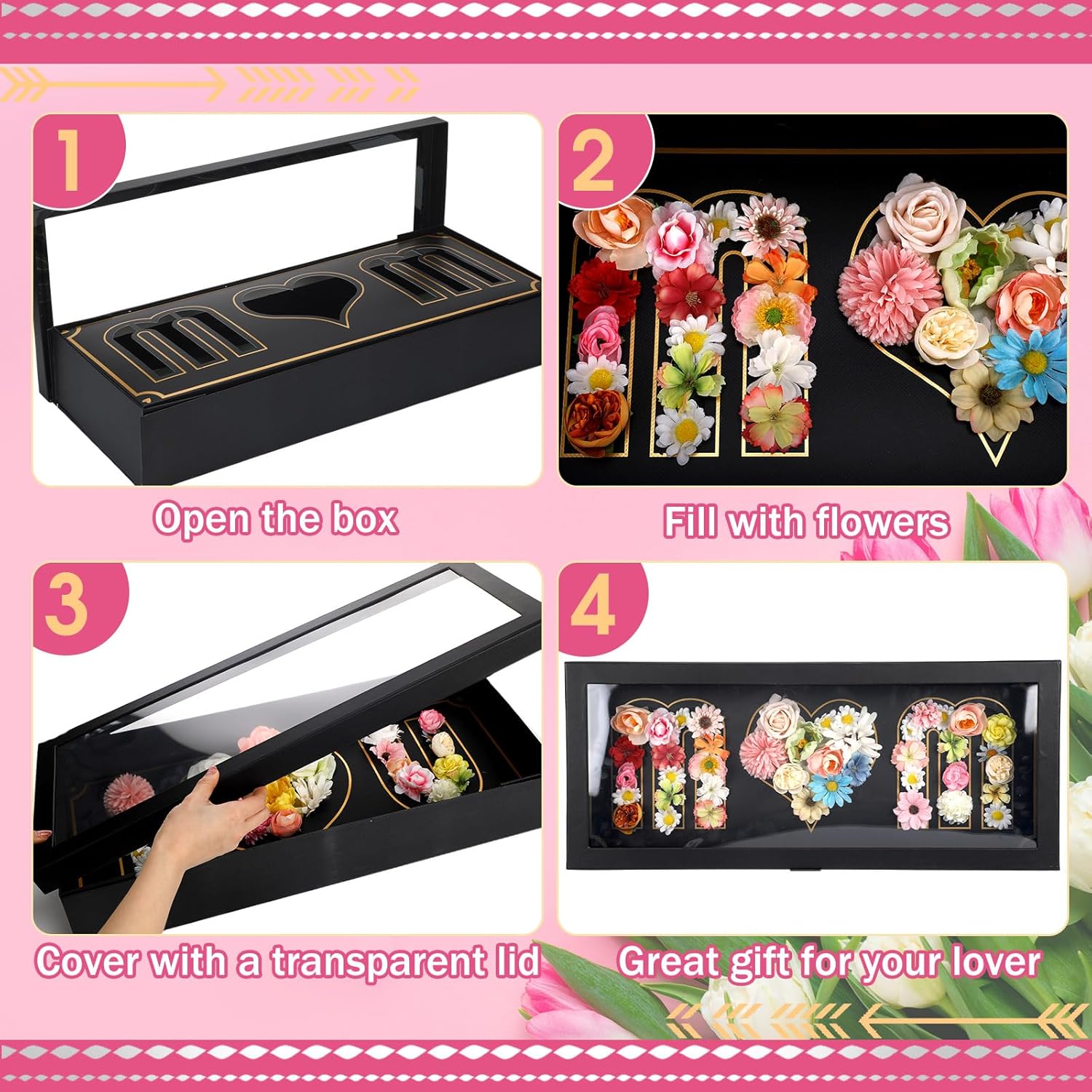 Features: Our empty flower boxes are designed to suit any occasion that calls for a touch of love and tenderness. These versatile gift boxes are made to elevate the joy of giving and receiving heartfelt presents for Valentine's Day, Mother's Day, anniversaries, birthdays. The DIY flower boxes are not only suitable for flowers, but also candy or snacks and cosmetics, giving your loved ones a little surprise and expressing your love to them. Specifications: Material: cardboard, plastic Color: black Size: about 24 x 9.8 x 1.4 inches/ 61 x 25 x 3.5 cm Package includes: 6 x MOM letter shaped fillable boxes Notes: Manual measurement, please allow slight errors on size. The color may exist a slight difference due to different screen displays.
