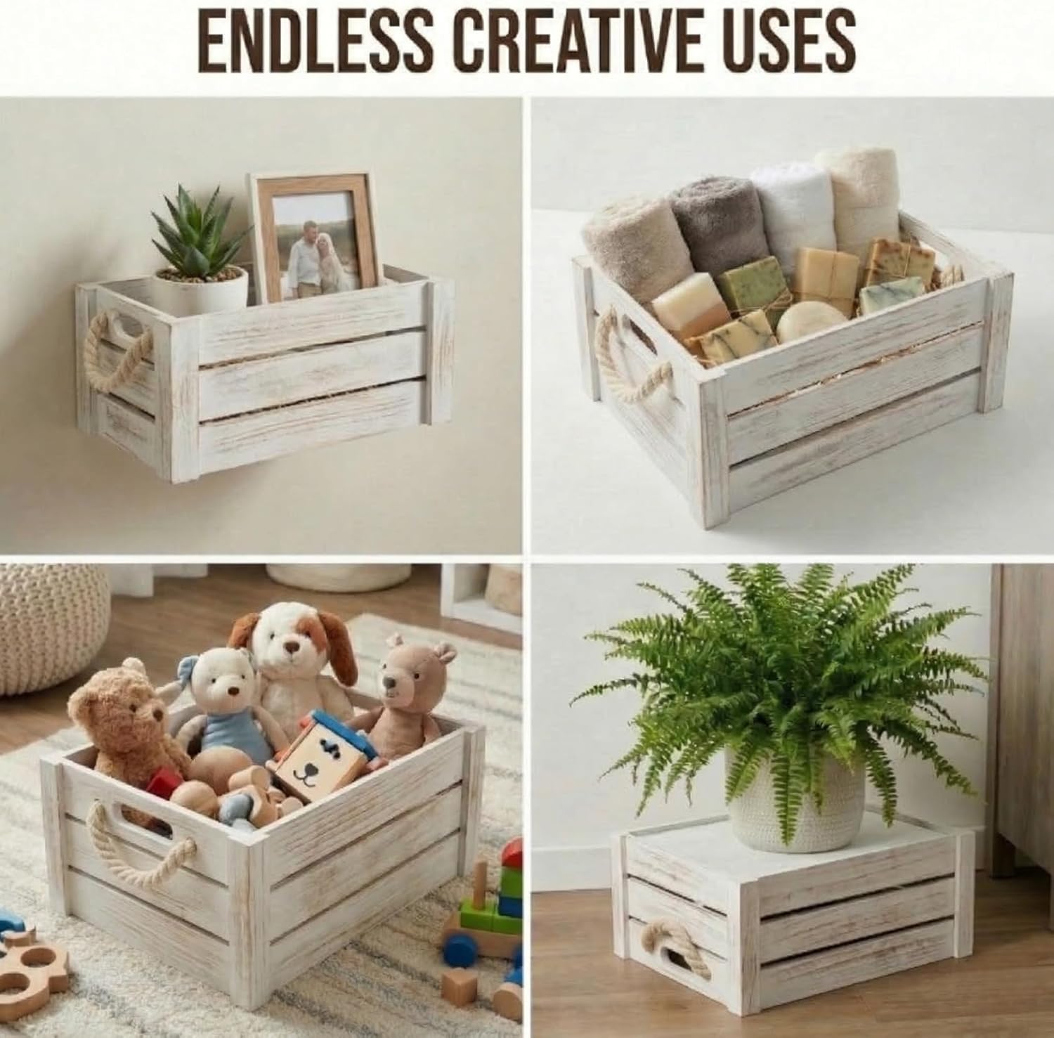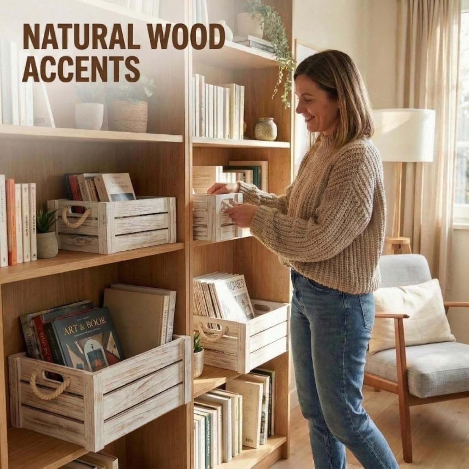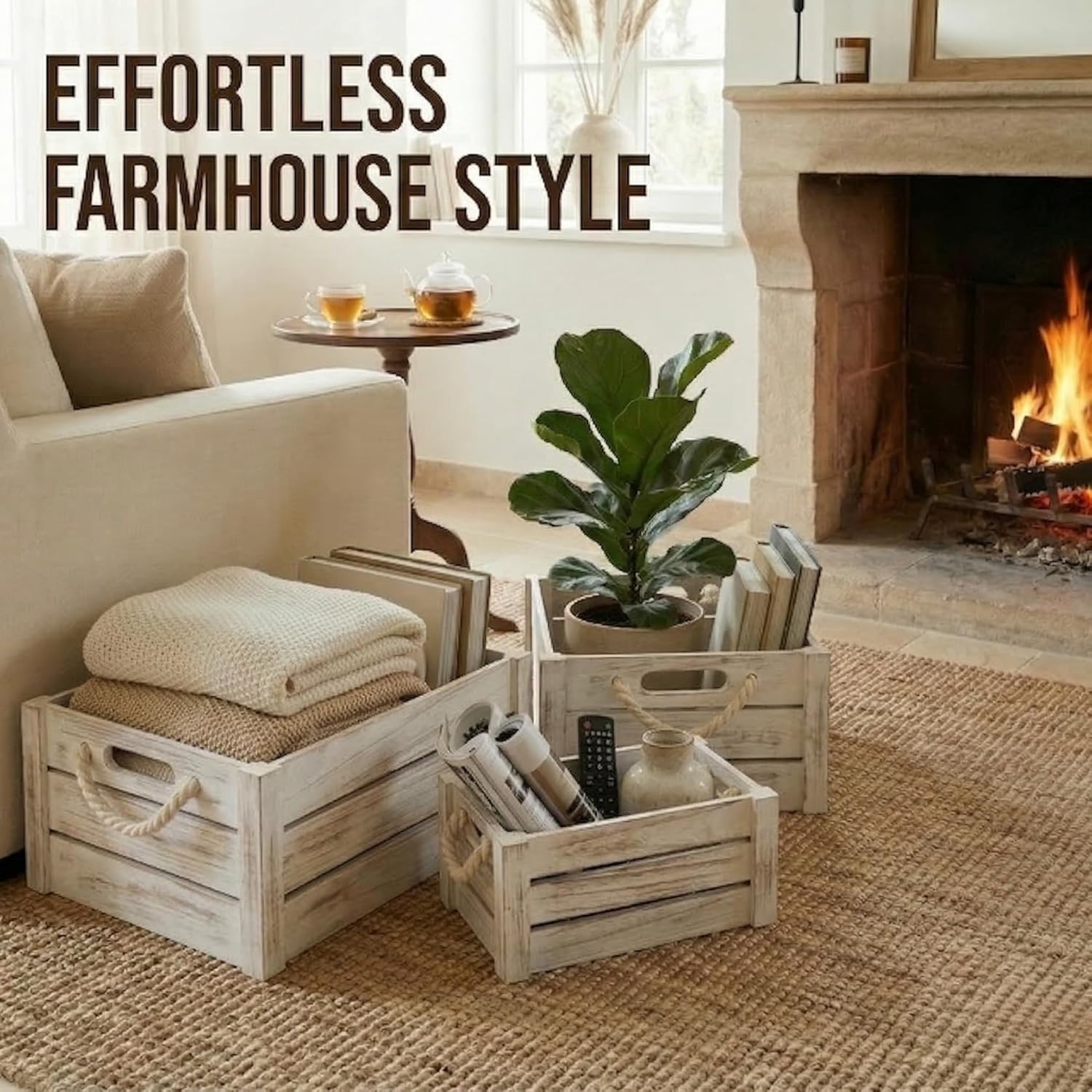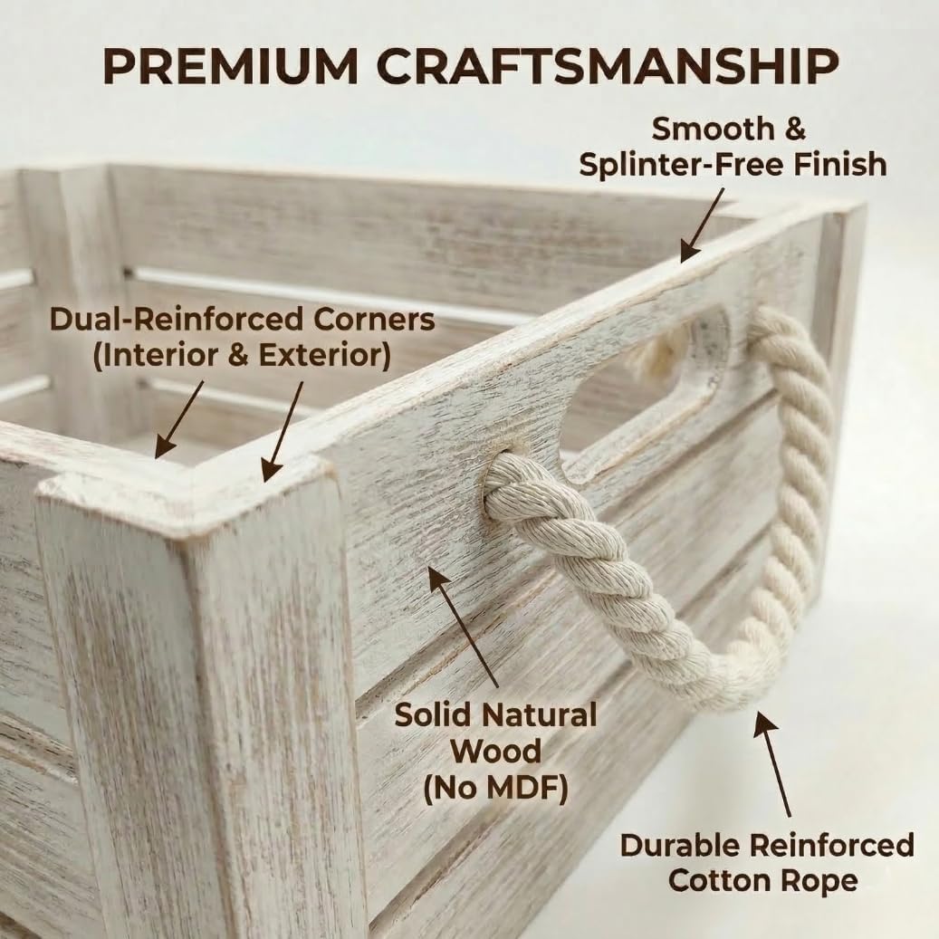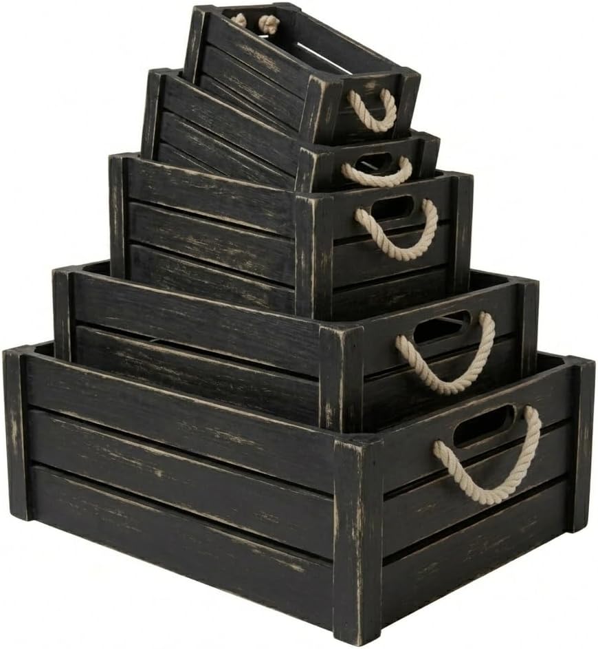 MODERN FARMHOUSE STYLE FOR EVERY ROOM Bring warmth, organization, and natural charm to your home with this set of 5 rustic wooden crates from MINAJAY Home. Thoughtfully designed to combine functionality with timeless character, these versatile nesting crates offer practical storage for any space. EXCLUSIVE DESIGN & QUALITY Each crate is crafted from high-quality wood with smooth, splinter-free surfaces. Unlike basic storage boxes, our crates feature durable natural rope handles for easy transport and an elevated aesthetic. ENDLESS ORGANIZATION POSSIBILITIES Perfect for home organization and decorative displays. Use them to store: Kitchen essentials and pantry items Living room magazines, books, or blankets Bathroom towels and toiletries Plants, succulents, or craft supplies Gift baskets, wedding decor, and retail displays SPACE-SAVING NESTABLE DESIGN When not in use, these three boxes nest perfectly inside each other to save valuable space. Their authentic wood grain fits seamlessly into farmhouse, vintage, or modern rustic interiors. SPECIFICATIONS (PLEASE MEASURE YOUR SPACE) Large: 16 x 12 x 6 Inches Medium: 14 x 10 x 5.5 Inches Small: 12 x 8 x 5 Inches Pro-Tip: Check your shelf or countertop dimensions to ensure a perfect fit. ABOUT MINAJAY HOME At MINAJAY Home, we create beautiful, practical storage solutions inspired by peaceful, well-organized interiors. Our collections combine natural materials with thoughtful craftsmanship to bring harmony and style to your home.