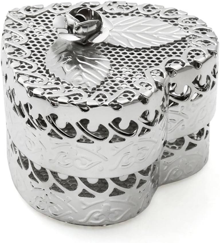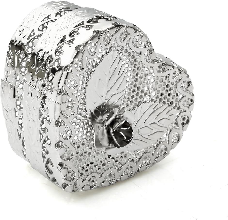 Our rose heart favor box features beautiful details of laser cut- out floral and a 3-dimensional rose pattern on top of the lid. Material: Metal Favor box measures 2.2" l x 2.4" w x 1.8" h.