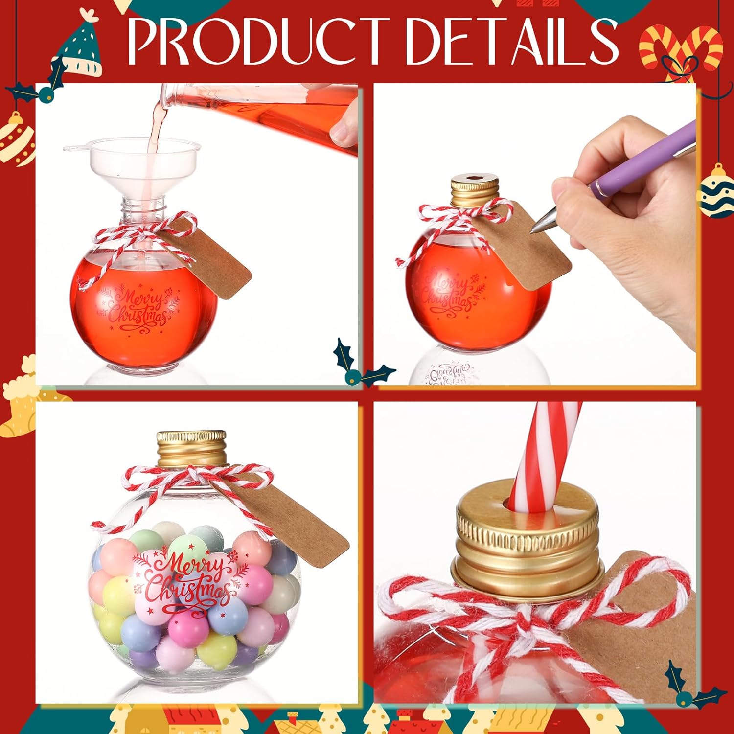 Features: Sweet combination: The Christmas wine ball can be applied to pour drinks or wine into a bottle without spilling, and can be hung indoors and outdoors to add charm to your Christmas and other themed parties Widely application: The festive wine ball can be applied as a creative gift wrapping method for occasions such as Christmas, birthdays, weddings, engagements, anniversaries and memorial parties to leave memorable and fun memories for your guests Specifications: Material: plastic Color: clear Size: 6 oz / 200 ml in capacity Package includes: 30 x Round plastic bottles 30 x Tags 30 x Red and white striped straws 5 x Funnels 1 Bundle of red and white rope Notes: Manual measurement, please allow slight errors on size. The color may exist a slight difference due to different screen displays. Some flaws in the printing pattern are unavoidable, please purchase with caution