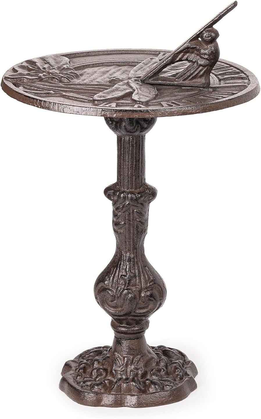 Elevate your outdoor space with our Vintage Cast Iron Sundial—where timeless functionality meets ornate garden charm. Crafted from solid cast iron,floral carvings, a lifelike perched bird, clear Roman numeral markings and classic sundial design. More than a decor piece, it's a functional sundial, adding a playful, practical touch to your outdoor space. Whether displayed in a flower bed to complement your plants or on a patio to add rustic flair, this sundial turns ordinary outdoor areas into charming and timeless landscaping.
