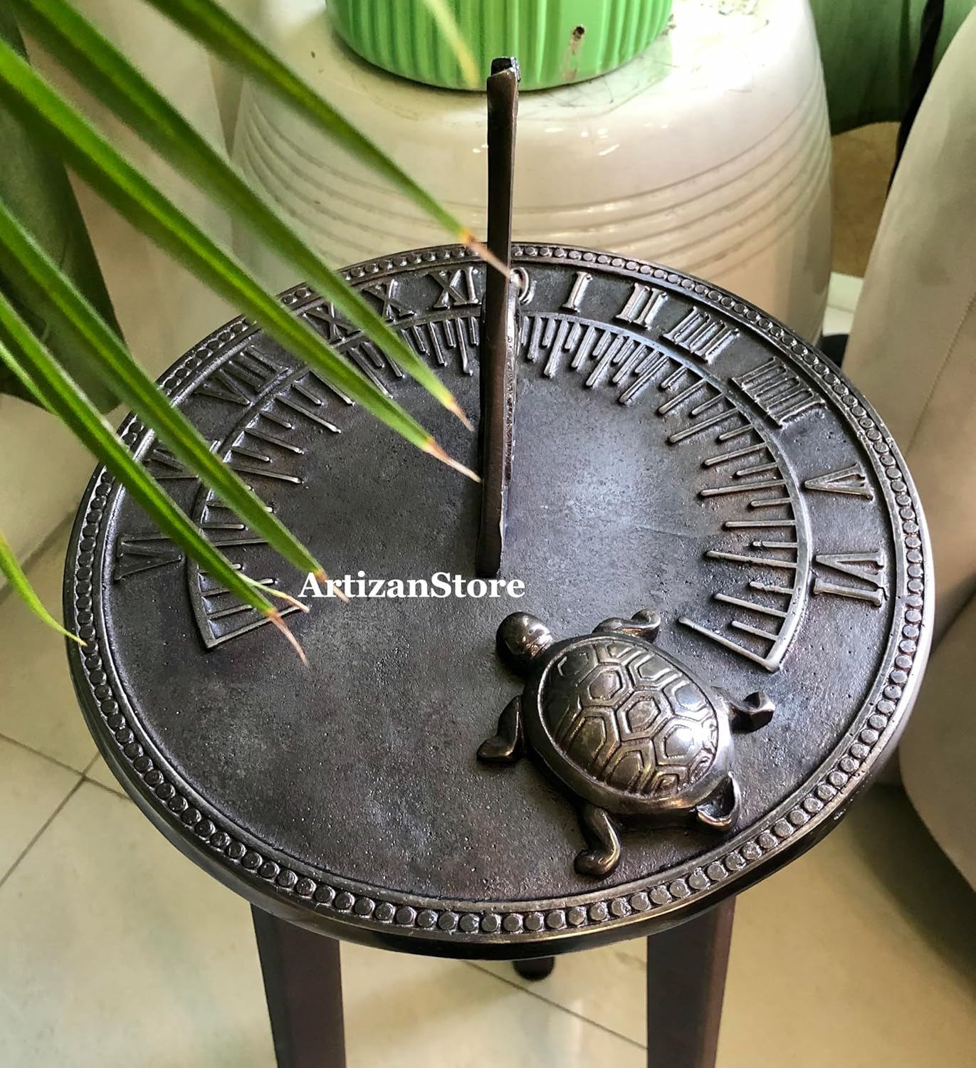 Solid brass Tortoise sundial highlights. The motto reads, "I am silent without the sun." The ornamentation and fine detailing reflect gothic Tortoise design, and a bold, polished gnomon shoots skyward.