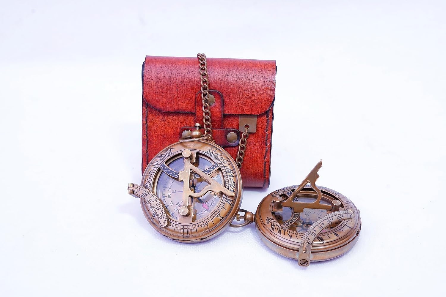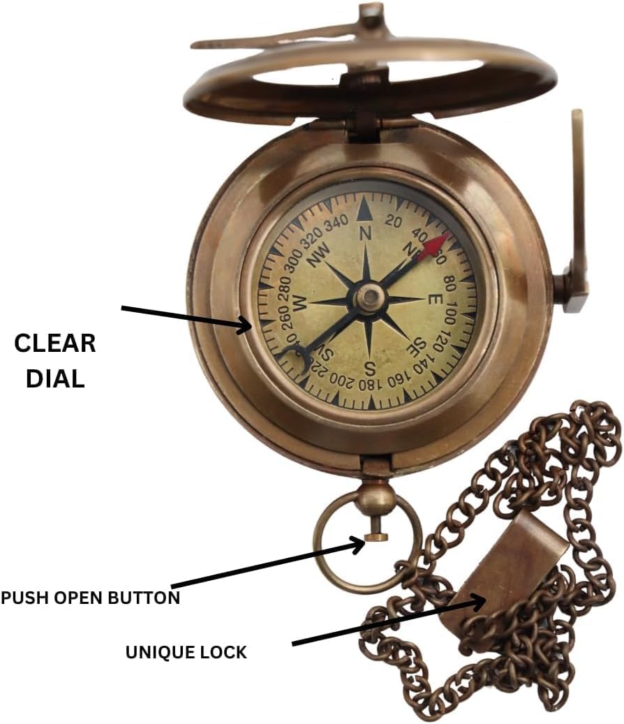 Product Description (SEO-Rich) Experience classic exploration with this Antique Brass Sundial Compass, a handcrafted masterpiece inspired by historical maritime navigation tools. This compass features a functional magnetic dial, beautifully engraved Roman numeral sundial, and precision-crafted brass frame — making it both a working instrument and a striking display piece. The compass includes a hand-stitched leather case, complete with a brass chain, offering both protection and a vintage adventurer aesthetic. Whether you’re using it as a collectible, a travel accessory, or a décor item, its historical charm and unique craftsmanship stand out. Perfect for gifting on birthdays, anniversaries, graduations, Father’s Day, Christmas, or to anyone who loves navigation tools, nautical history, or vintage-style décor. Add a touch of old-world adventure to your desk, shelf, or study. Each compass is handmade by skilled artisans, so slight variations add to its authenticity and character. 📏 Product Specifications Material: Solid Brass Finish: Antique Vintage Finish Includes: Brass Compass + Working Sundial + Leather Case + Chain Dial Type: Magnetic Compass Craft: Completely Handmade Style: Vintage / Nautical / Explorer Dimensions: 3 inch