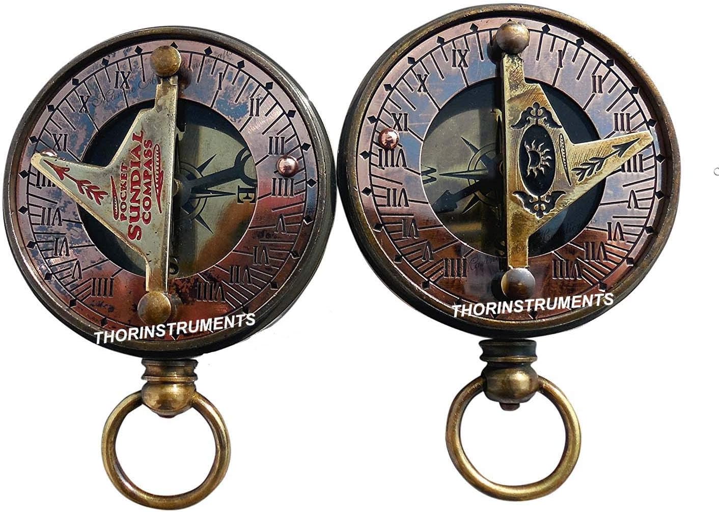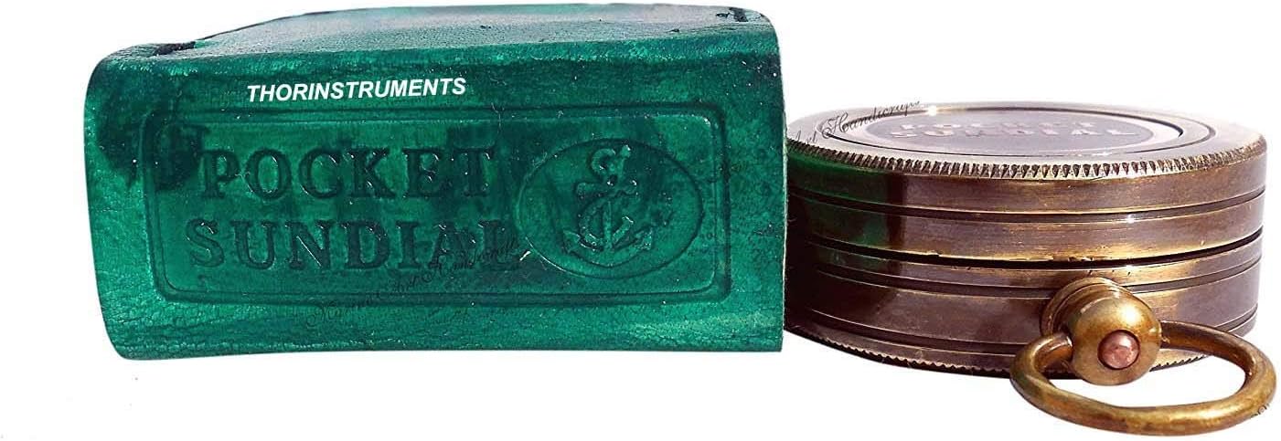 This is Hand-made copy of Brass Reproduction Vintage Decor Pocket Sundial Compass used in 1800s pocket Sundial Made of Solid Brass Internal direction pointer Rotating Sine Chart Engraved Table. We specialize in fabricating Antique Scientific Instruments that link us to our scientific past, and in making them accessible to all those who love the art and beauty of science. At affordable prices. We select instruments who’s scientific, historic, and aesthetic value make them interesting and which can be reproduced using today's materials and techniques. Approximate Size: - 4.5cm - Dia x 1.8cm - Thick (Sundial Compass)