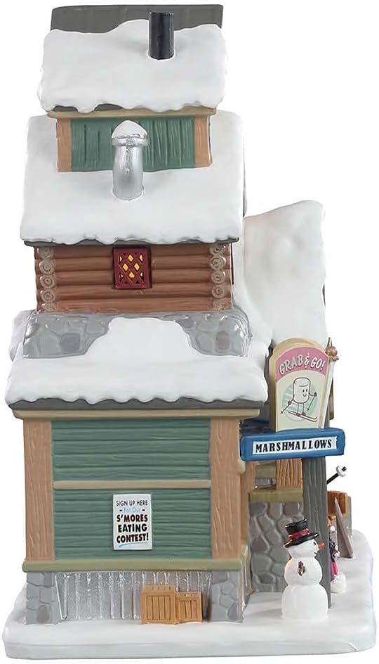 Lemax - Vail Village - Lighted Building: S'mores & Snow S'mores 'N' Snow is full of ooey-gooey goodness. This crooked-roofed restaurant is full of delicious treats and good times. Outside, there's a walk-up window for some grab-and-go snacks and hot beverages. Someone is sitting outside next to the fire, roasting a marshmallow on a stick. Inside, you can get cozy, as a sign advertises there's hot cocoa available and a s'mores eating contest!