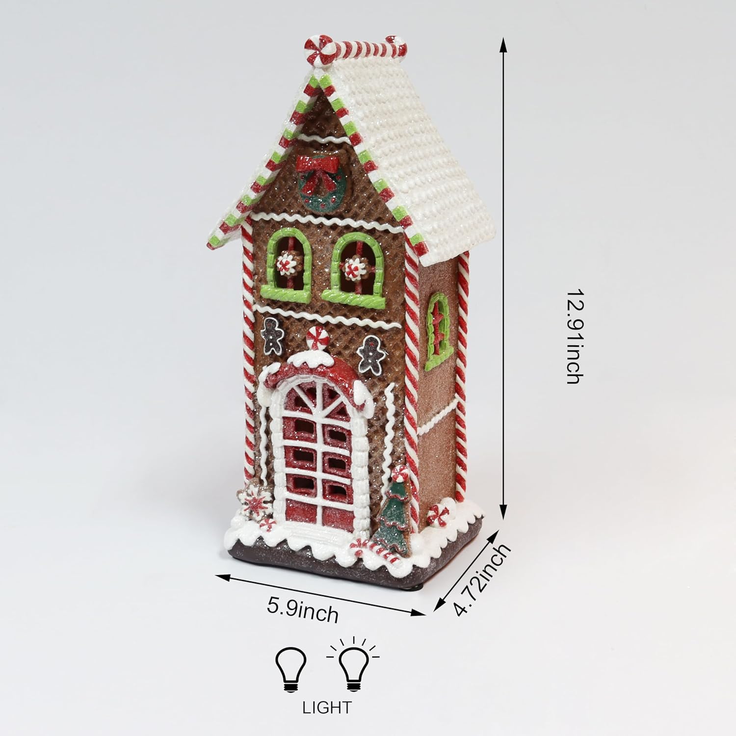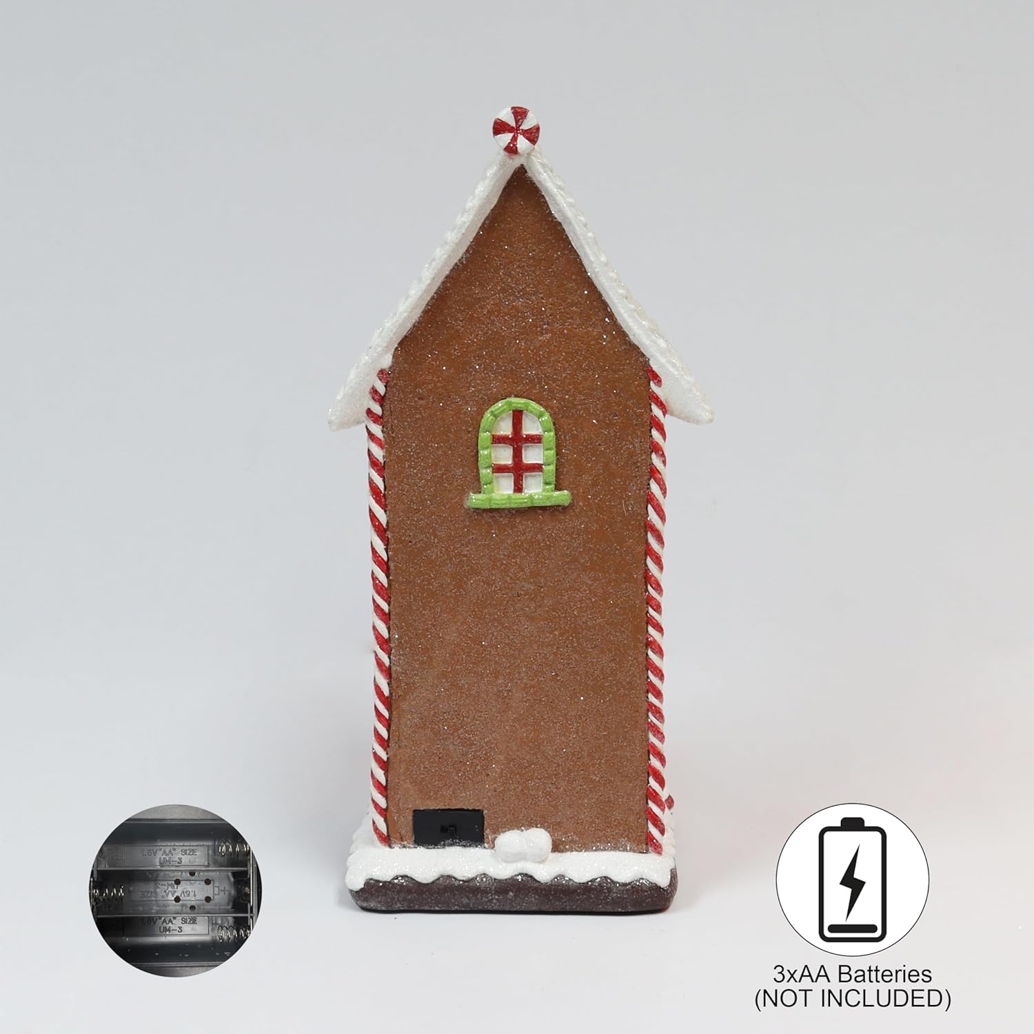 Capture the heartwarming spirit of the holidays with the Moments In Time 12.9”H LED Lighted Gingerbread Village House, a festive masterpiece that brings sweetness, light, and joy into your home. Standing tall at nearly 13 inches, this hand-painted polyresin decoration transforms any room into a whimsical winter wonderland. Every detail of this gingerbread-inspired house evokes the magic of Christmas. The structure is coated with shimmering “frosting” snow, twinkling candy-cane stripes, and a glistening rooftop adorned with sugar-like glitter. Two adorable gingerbread figures greet visitors by the doorway, while a festive wreath sits proudly above the front arch, symbolizing holiday cheer. Candy-like accents and peppermint details bring a touch of nostalgia and whimsy, reminiscent of a cozy Christmas bakery from your childhood dreams. As evening falls, the LED lights softly illuminate the windows and candy details, creating a warm, golden glow that spreads festive magic throughout your home. This inviting light adds depth and dimension to your Christmas village display, making it a stunning centerpiece on any mantel, sideboard, or tabletop. Conveniently battery operated (3 AA batteries not included), this light-up gingerbread house offers easy setup and freedom of placement no cords or outlets needed. The sturdy polyresin craftsmanship ensures lasting durability, so you can enjoy it for many holiday seasons to come. Each piece is carefully packaged in Moments In Time’s signature gift-ready box, making it a perfect present for loved ones or a special addition to your own collection. Celebrate the charm, warmth, and sweetness of the season with this radiant LED Gingerbread Village House, a timeless decoration that spreads joy year after year. Dimensions: 5.91”L x 4.72”W x 12.91”H Weight: 1.98 lbs Material: Hand-Painted Polyresin Lighting: Warm White LED Lights Power Source: Battery Operated (3 AA Batteries Not Included)