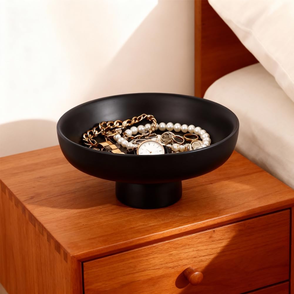 Add elegance and functionality to your home with this Matte Black Pedestal Bowl. Its clean and modern design makes it a standout piece for any tabletop, from coffee table to dining table centerpiece. Crafted from durable resin with a matte finish, this black pedestal bowl is perfect for holding fruit, wrapped candy, dry snacks, and decorative items. Use it as a fruit bowl black for kitchen counters or as a decorative fruit bowl to add texture and depth to your home decor.This modern decorative bowl is also a practical choice for organizing small items. It can be used as a black key bowl in your entryway or as a pedestal fruit bowl to hold fresh or dried botanicals, pinecones, potpourri, or candles. Its wide opening and footed base make it versatile and stable for use in any room. Whether used on a console, shelf, or dining table, this bowl is the perfect decorative bowl for table styling.The matte black finish gives this black decor bowl a sophisticated touch, while the footed bowl design adds height and presence without overwhelming your space. It pairs seamlessly with other decor elements, and you can mix and match with rustic vases, modern fruit bowls, or centerpiece bowls for table decor for a curated look.
