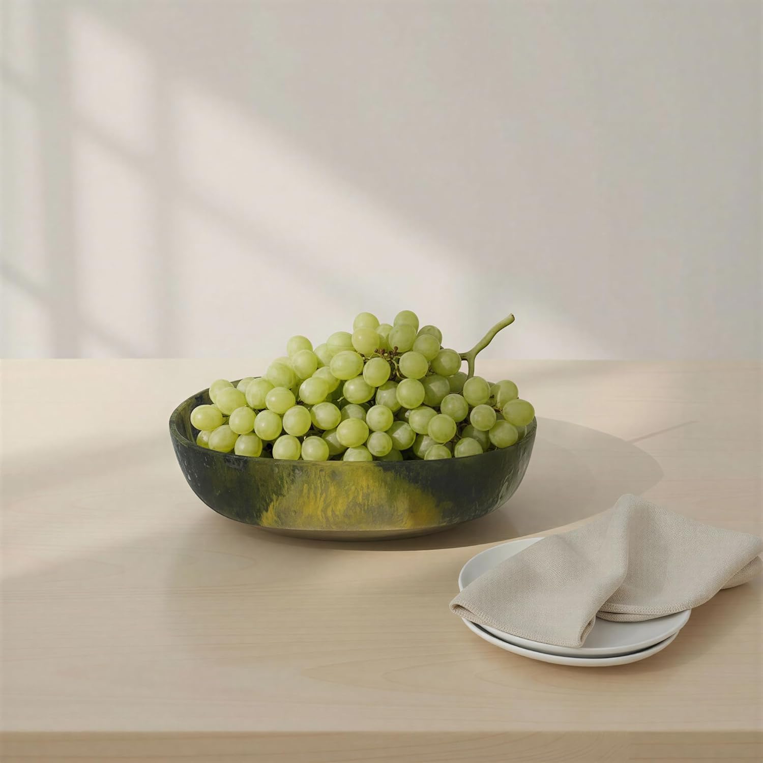 Add the Oval Marbled Resin Decorative Bowl to any space that celebrates fluid design and artisan detail. This sculptural bowl features a hand-poured marbled resin surface in lush green tones, creating a one-of-a-kind swirling pattern with a sleek, glossy finish. Perfect for Scandinavian, Contemporary, Coastal, French Country, and Farmhouse aesthetics, it brings visual depth and organic elegance to tabletops, consoles, or shelves. Use it as a catchall for keys and accessories or let it stand alone as a statement piece. Made of resin, each bowl is uniquely crafted for a truly individual look. Measures 13.5 inches in length, 8.5 inches in width, and 3.25 inches in height, ideal for layering into curated home displays. A modern accent that blends form, function, and individuality.