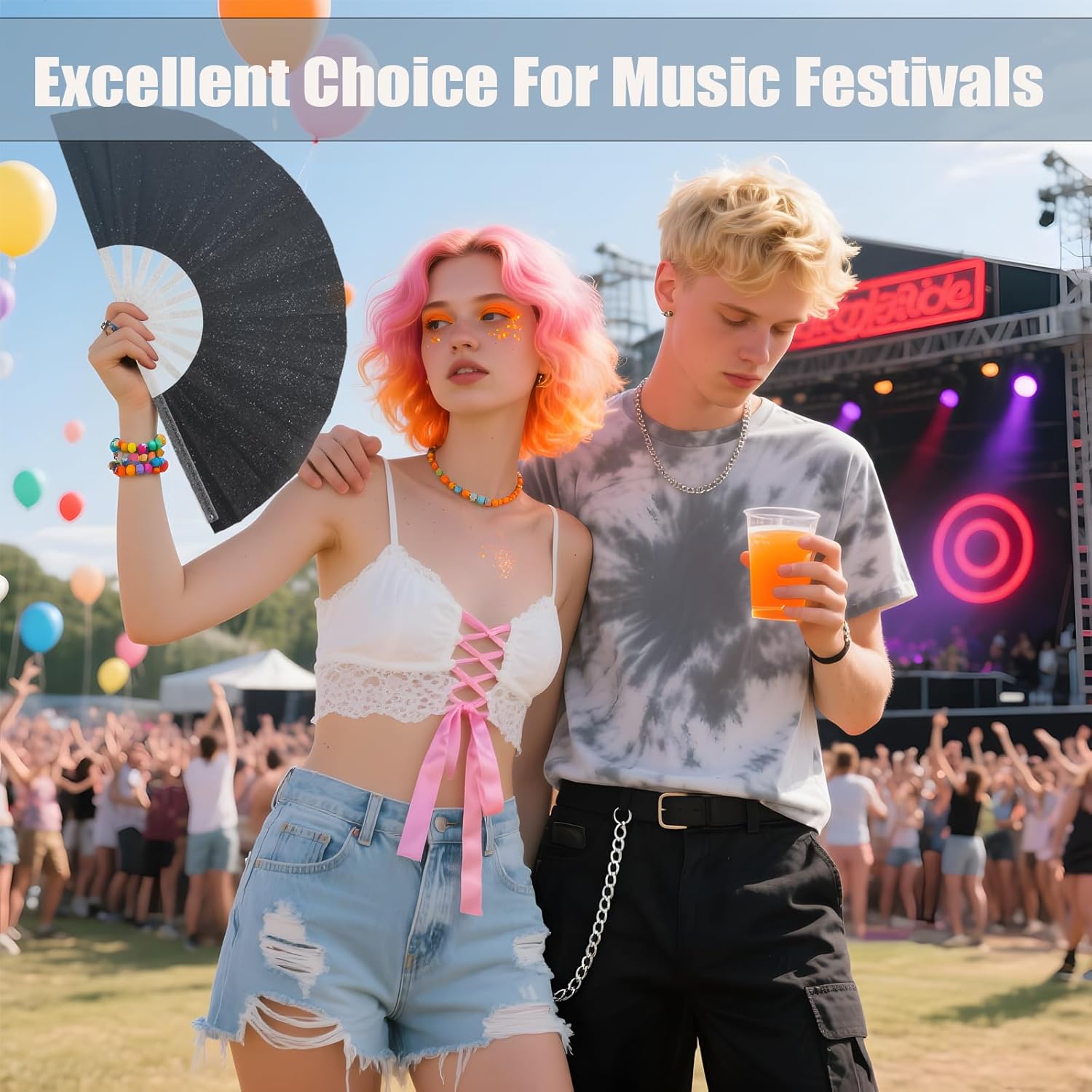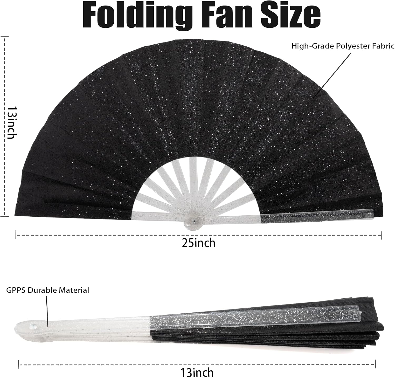 Make a bold statement with the 13-Inch Foldable Hand Fan, a dazzling and functional accessory perfect for raves, festivals, dance performances, and home décor. This fan is made of shiny polyester fabric and GPPS structure, which is both stylish and durable. This fan has a unique design with a flashing effect, shining brightly under the light and making a unique "click" sound when turned on.. Measuring 26 inches when open, it delivers powerful airflow to keep you cool during summer nights or crowded events. Whether you're heading to a music festival, preparing for a line dance performance, or looking for a decorative fan for your home, this foldable hand fan is the ultimate choice. Available in 10 vibrant colors and perfect for gifting to ravers, dancers, or party lovers.