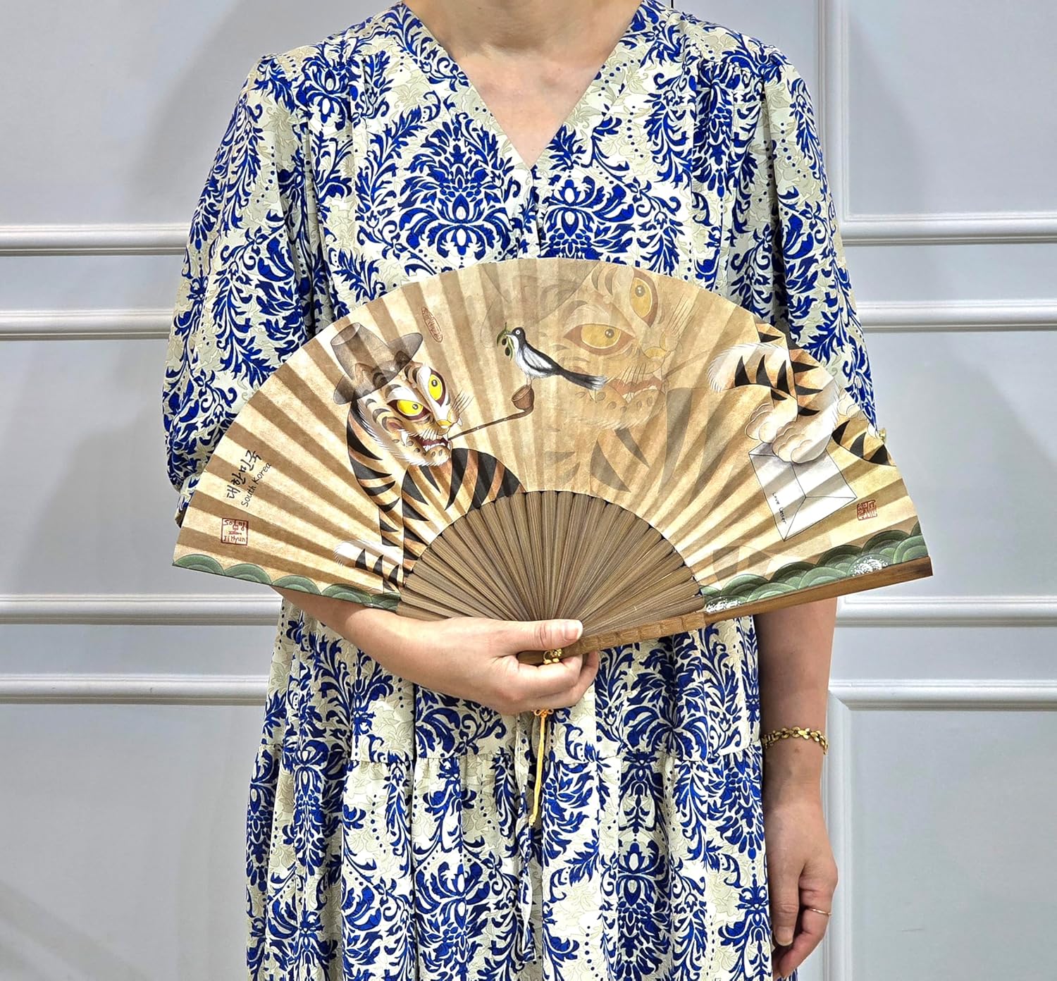 This Korean folk art folding fan showcases the Minhwa painting “Tiger and Magpie,” a beloved symbol of good luck and protection in Korean culture.Created by folk artist Song Ji-Hyun, the design captures the cheerful magpie and dignified tiger under a pine tree, representing balance and wisdom.Made with Hanji (Korean mulberry paper) and natural bamboo ribs, this fan blends traditional beauty with practical craftsmanship.Measuring 11.5 inches in length and 20.5 inches when opened, it serves as a decorative piece for homes, cultural spaces, or events.Ideal as a Korean souvenir, art gift, or collectible, this fan embodies both artistry and heritage, making it a unique addition to any cultural gift collection.⚠️ Caution:Keep away from moisture or prolonged sunlight to prevent color fading.Avoid excessive force when opening or closing to maintain shape.For decorative use; not intended for high-humidity environments.