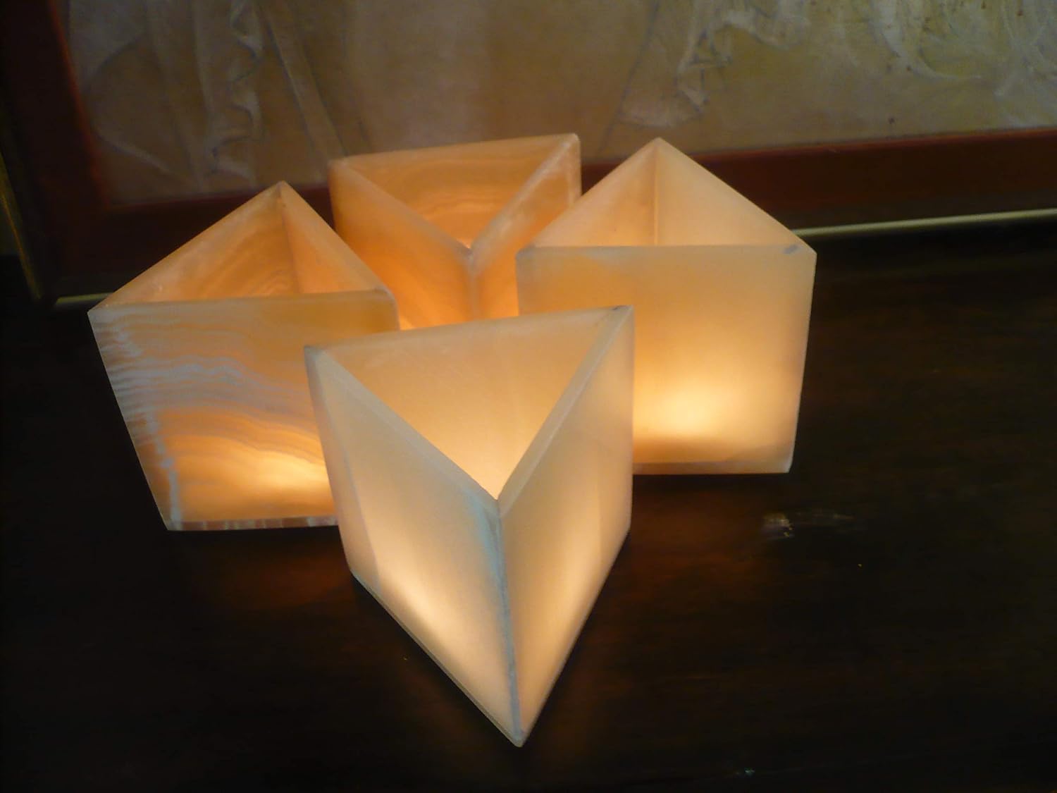 Set of 4 finely constructed alabaster pyramids, 1/2 cm sides joined with artisinal skill using the finest quality Egyptian alabaster. The pyramid is the most well known of all icons, and its geometric shape suites all types of decor. The thinness of the sides allows for maximum translucence for a transformational experience.