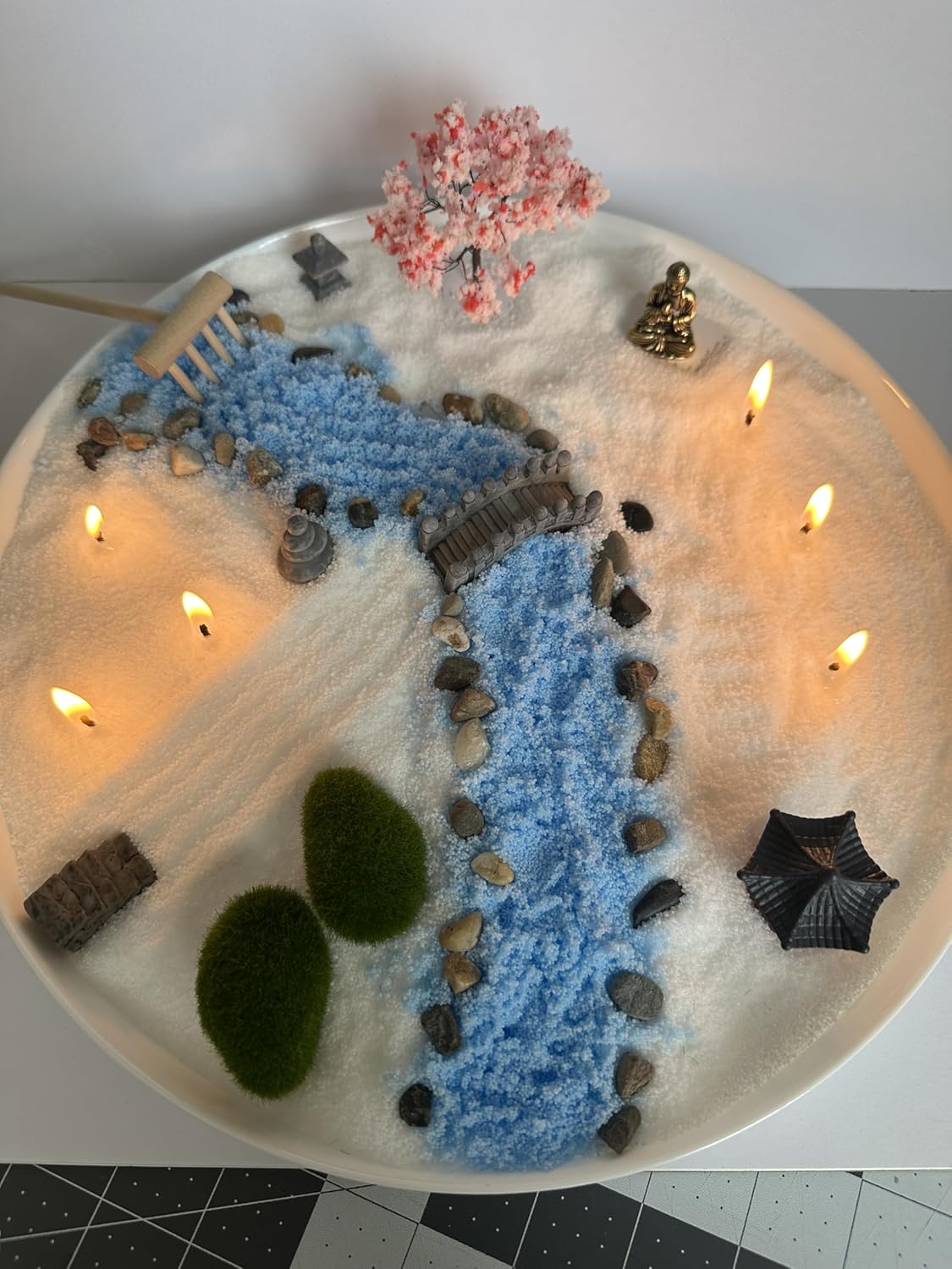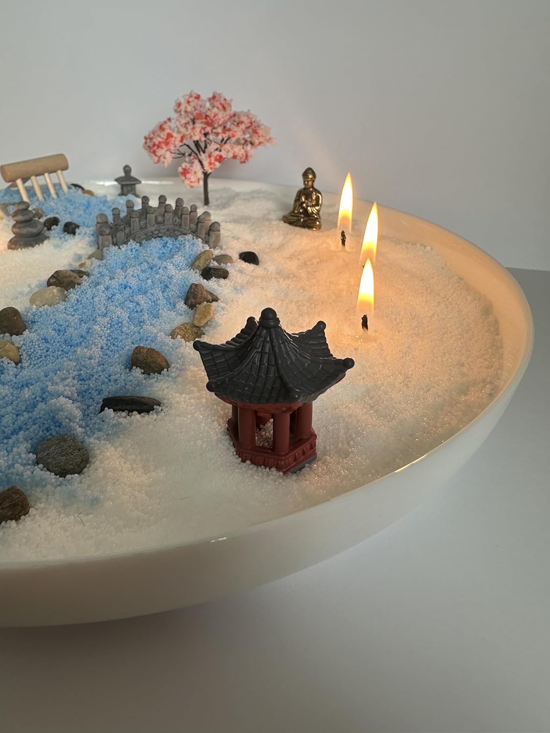 ZEN Garden DIY Candle Set Create Your Own Tranquility – A Unique DIY Candle Experience Transform your space into a peaceful retreat with the ZEN Garden DIY Candle Set. This all-in-one kit allows you to design your own calming candle display, combining the soft glow of candlelight with the meditative beauty of a ZEN garden. Perfect for stress relief, mindfulness, and home decor, this set includes high-quality sand wax or pearl wax, decorative stones, a stylish tray, and wicks to craft your personal ZEN-inspired ambiance. Whether for relaxation, meditation, or as a thoughtful gift, this DIY candle set offers a creative and soothing experience. ZEN Garden Candle set includes: - Bowl, white and blue sand wax, 20 wicks. - Garden parts: Buddha, Sakura tree, pagoda, bridge, stairs, garden miniatures, moss rocks, stones, rake.