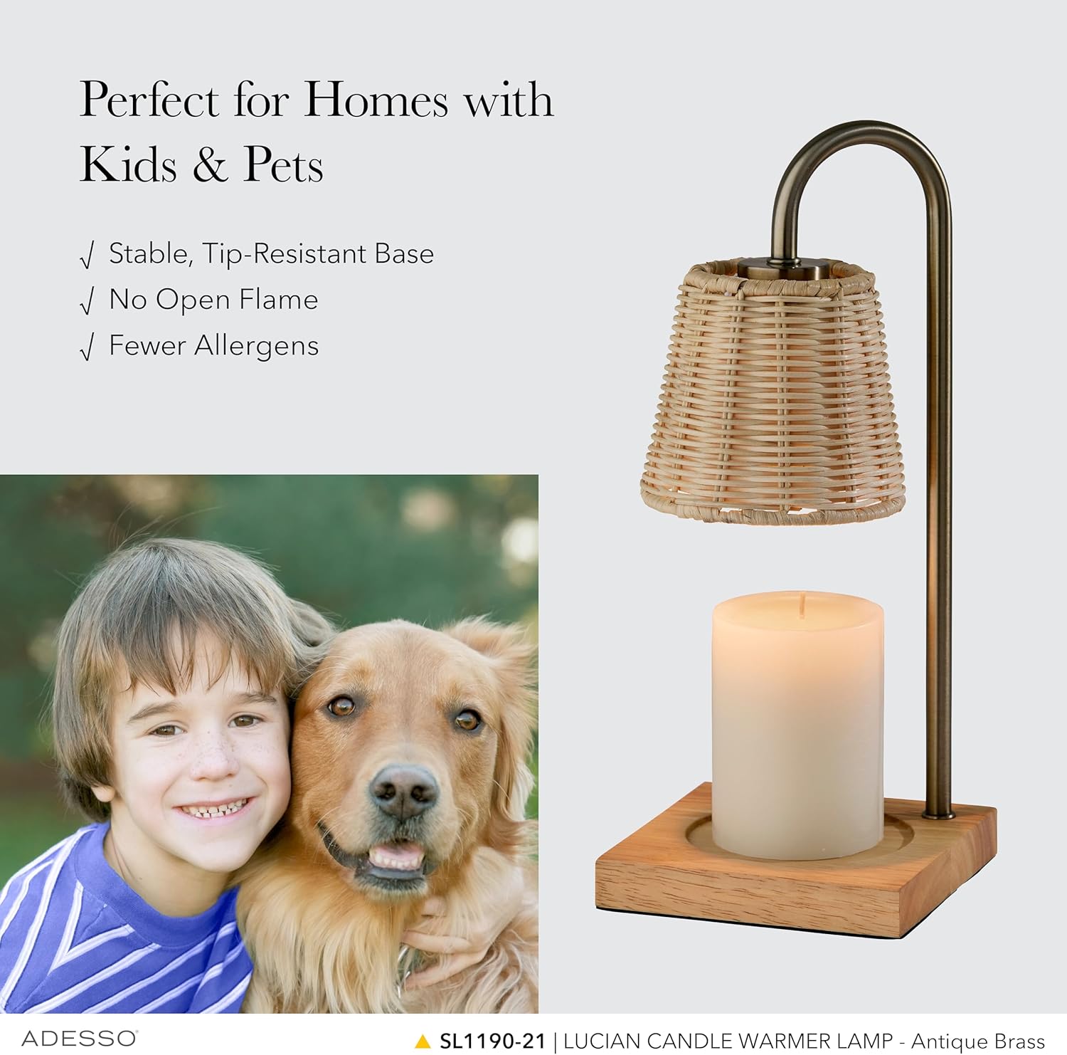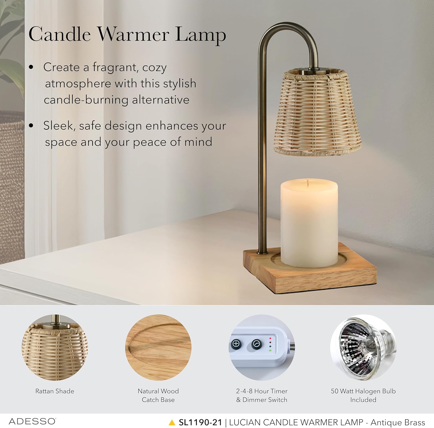 Transform any room into a warm, fragrant retreat with the Lucian Candle Warmer Table Lamp —a flameless wax warmer alternative designed for safer, cleaner, and longer-lasting home fragrance. Instead of burning a candle and releasing smoke, soot, and allergens, the included 50W GU10 halogen bulb gently warms your favorite jar candles from above, releasing a clean, even scent while preserving candle life. Crafted with style in mind, this candle warming lamp complements any home, office, restaurant, or store décor. Great for families with children and pets, commercial buildings, home or property rentals, and students or adults living in dorms and apartments with open-flame restrictions. A sturdy base with a recessed cradle holds your candle firmly for safe, stable use on a nightstand, mantel, bedside table, or living room end table. With a full-range dimmer and built-in timer, you control both the light level and fragrance output—ideal for your home office, kitchen counter, or bedroom decor. Just plug it in, set your brightness, choose your timer setting, and enjoy effortless, flameless fragrance all day or evening. Whether you're searching for a safer candle alternative, upgrading your house décor, or looking for a thoughtful gift for candle lovers, this lamp delivers style, function, and worry-free ambiance in one beautifully made design.
