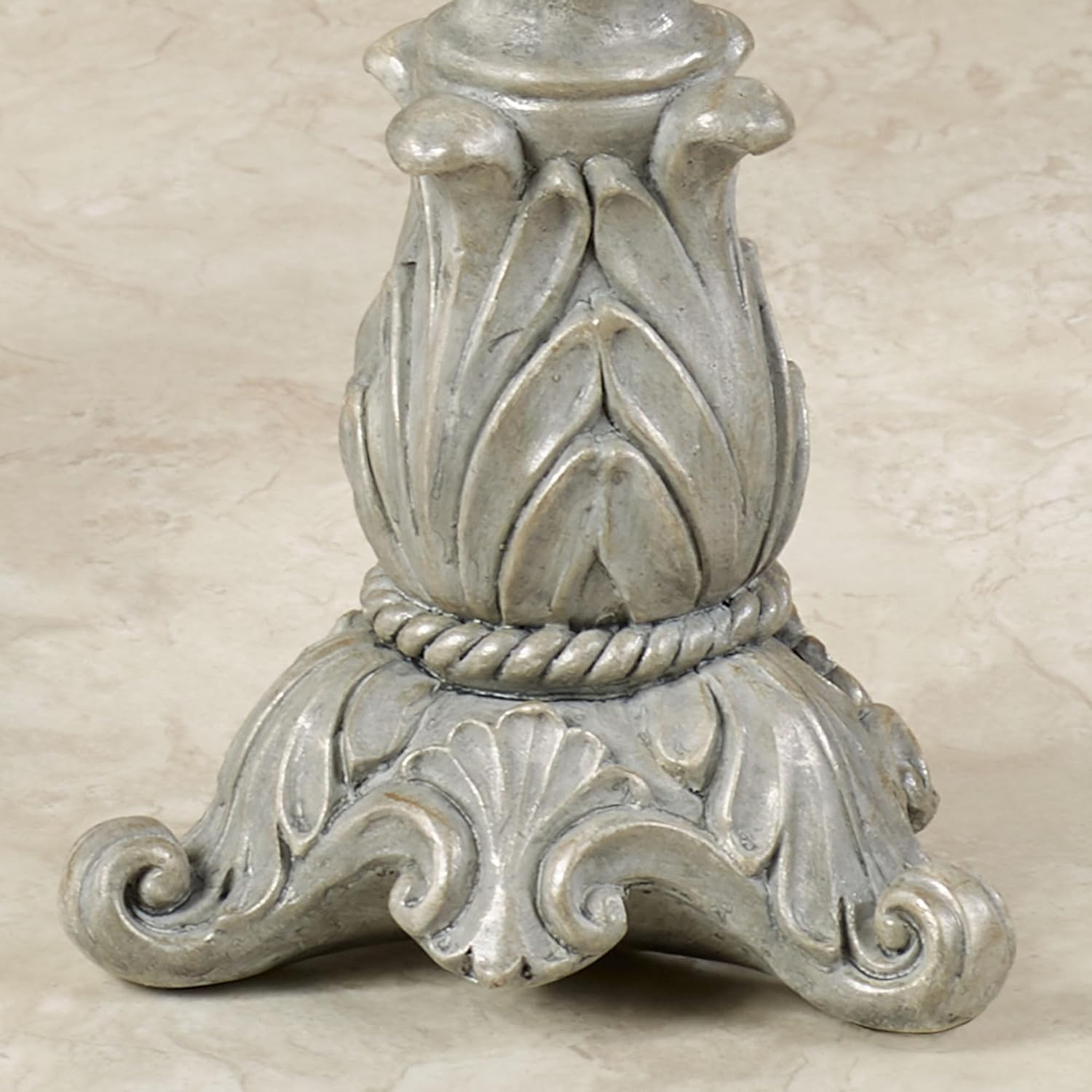 Handpainted marbled blue, brushed gray, and golden touches create a stately appeal upon the Lionna Candleholder Set. Crafted from resin, each candleholder features a footed base, acanthus leaves, twisting accents, scrolls, and a candlecup to hold your 3" dia. candle. Candleholders are 5"dia.x12.5"-14"H. The Lionna Candleholder Set is resin. Never leave a burning candle unattended. Dust with a soft, dry cloth. Do not use chemicals, polishes, or abrasives. Designed by Touch of Class(R)! Set of Two candleholders (one of each) Handpainted in soothing hues Marbled blue and brushed gray design Accented with golden touches Traditional resin candleholder set Acanthus leaf accents Holds your candles