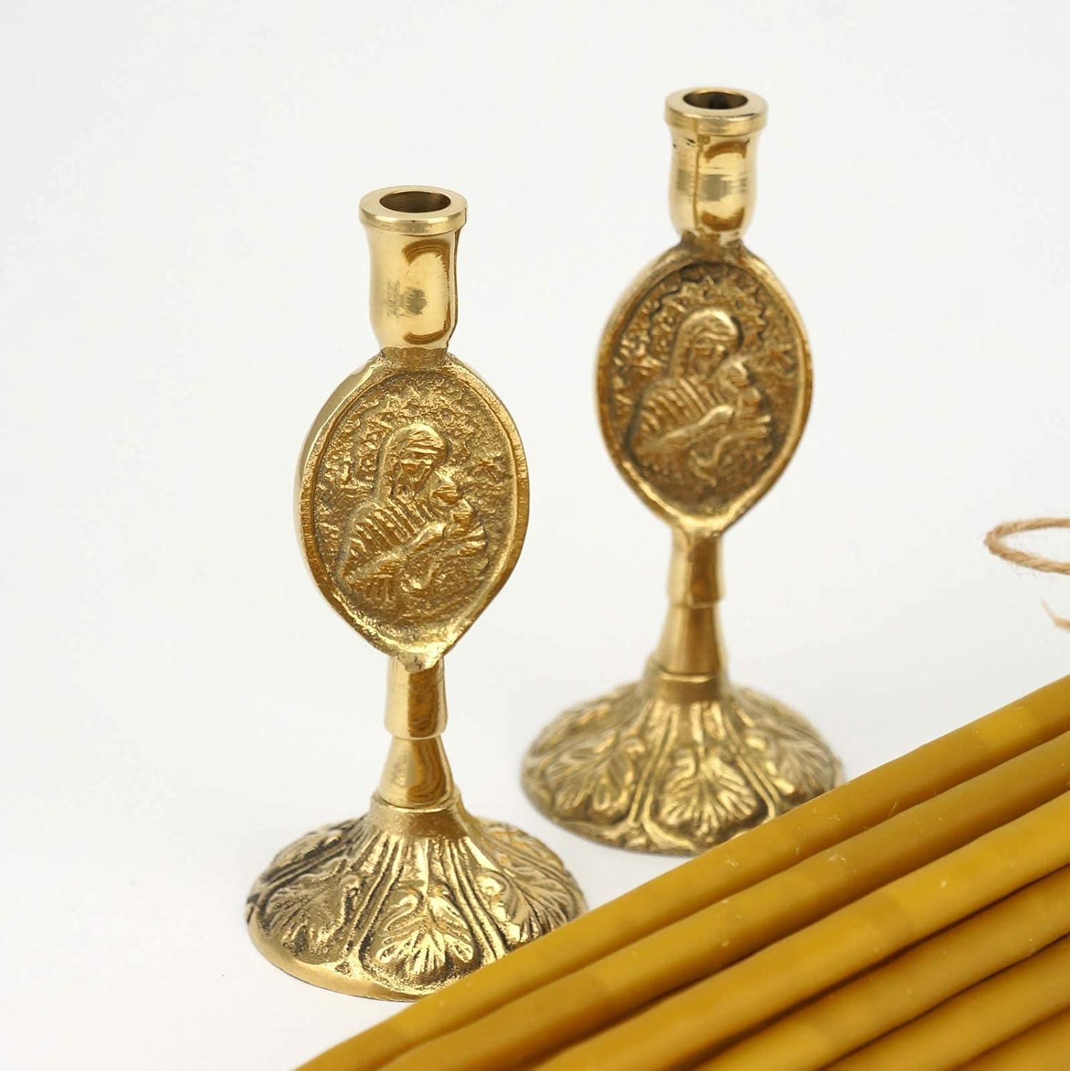 Set of 2 Theotokos Design Brass Candle Holders and 20 Pure Beeswax Church Candles, Orthodox Tapers, Home Altar Package includes: – 2 Single Brass Candle Holder – Theotokos Design and 20 pcs 100% Pure Beeswax Candles; Candle holder size: Height: 9.5cm (3.74 inch). Designed to hold 1/4 - 5/16 inch (6-8mm) candles. Candle Length: 9 inch (22cm), Base diameter: 3/4 – 5/16 inch (6-8mm) Handmade from 100% pure beeswax