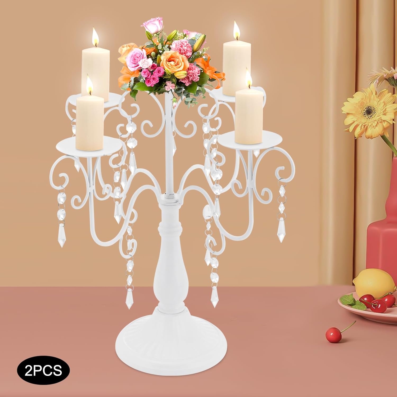 2Pcs Vintage Candle Holder, 5-Arm Candle Holder,Centerpiece Table Decorations,Candelabra for Weddings, Home Decor, Birthdays, Engagements, Anniversaries ,WhiteDescriptionThis beautiful vintage candle holder can create an elegant atmosphere for you and is the ideal accent for events and parties. With this candle holder, you can enjoy a candlelight dinner, a candlelight ambiance room, and so on, so that you can enjoy this romantic moment with your lover or family.Applicationcandle holder is suitable for weddings, home decor, birthdays, engagements, anniversaries, or any other festivals and events, romantic candlelight banquets, parties, table centerpieces, fireplaces, and more. It is suitable for a living room, dining room, kitchen, entryway, bar, family house, hotel, club, and other places.Specification Color: WhiteStyle: VintageMaterial: Iron, Artificial Crystal Process: Casting Assembly Required: YesMount Type: TabletopNumber of Heads: 5Number of Pieces: 2 Applicable Candle Diameter: Within 8cm/3.15inEach Candle Plate Diameter: 8.3cm/3.27inEach Base Diameter: 15.5cm/6.1inEach Product Size(L*H): 42*39cm/16.54*15.35inGross Weight: 2.4kg/5.29lbsNet Weight: 2.2kg/4.85lbsPackage Size: 45*30*20cm/17.72*11.81*7.87inPackage Included2* Vintage candle holderAll Accessories for AssemblyNotes1. Please keep the candle holder in a safe place and away from children.2. Please note that this candle holder does not include candles, flowers, or other items.3. Please allow the slight color difference caused by the shooting light and the 1-3 cm error due to manual measurement, and make sure you do not mind before ordering.