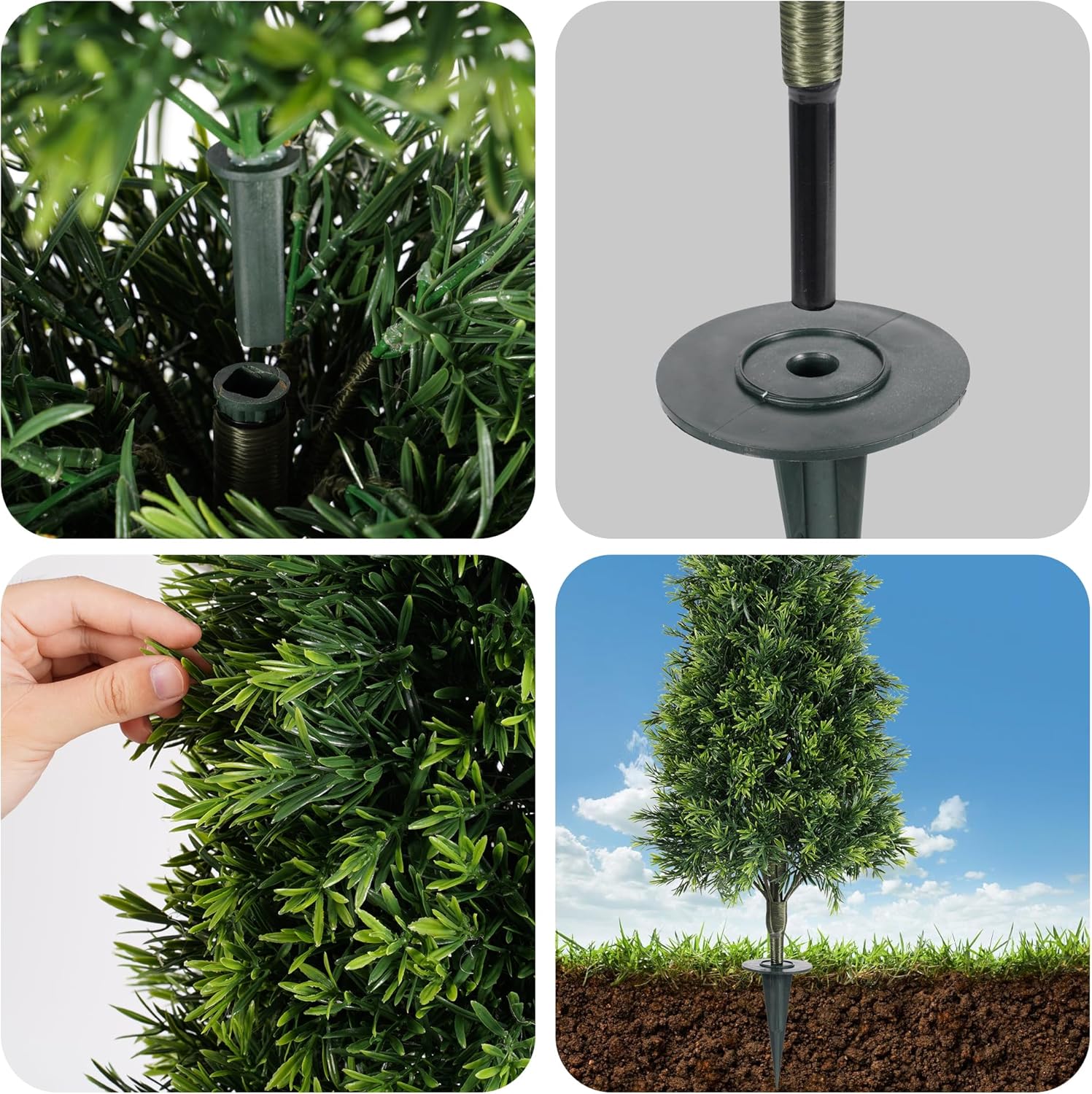 • PRODUCT DETAILS:FPROOM artificial trees for outdoor is made of UV plastic,the Cypress trees is 16 inch in diametel 36 inch in heigh,Every tree is divided into three sections: ground spike, trunk, and top.