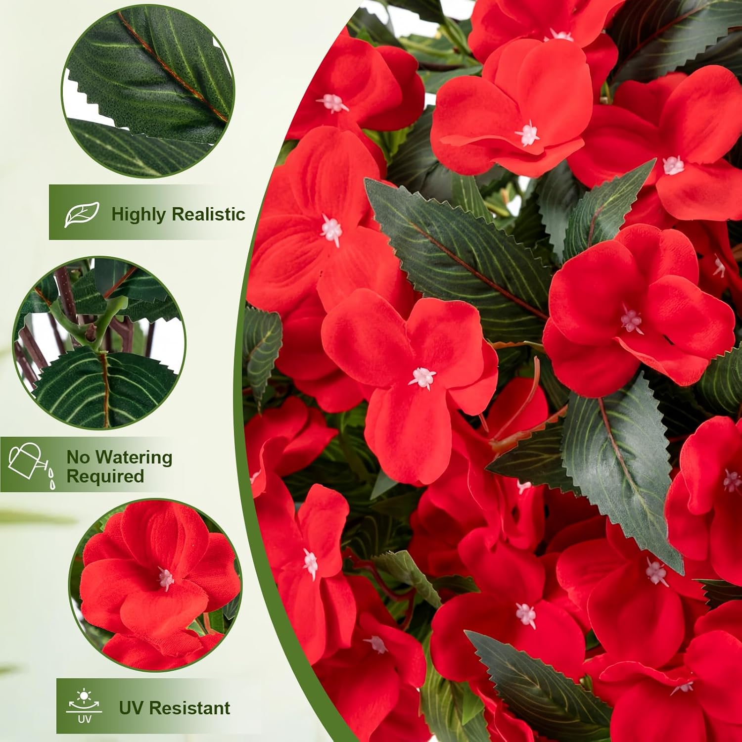 Features: Vibrant & Low-Maintenance Beauty: Enhance your space with this set of 2 pre-assembled 18-inch artificial impatiens topiaries, featuring plump, realistic blooms and leaves for a full, lifelike look—no watering, pruning, or fading ever! Crafted from high-quality UV-resistant plastic, they stay vibrant and beautiful year-round, indoors or outdoors, even in harsh weather. The weighted cement base in each pot ensures stability against moderate winds or storms, while easy setup means just place them where desired. Perfect for front porches, steps, windowsills, patios, gardens, terraces, or farmhouse decor—add seasonal flair effortlessly! Size: About 18 x 18 inches (height x width) Package includes: 2 x Artificial Impatiens Potted Plants Color: Red Notes: Manual measurement, please allow slight errors on size