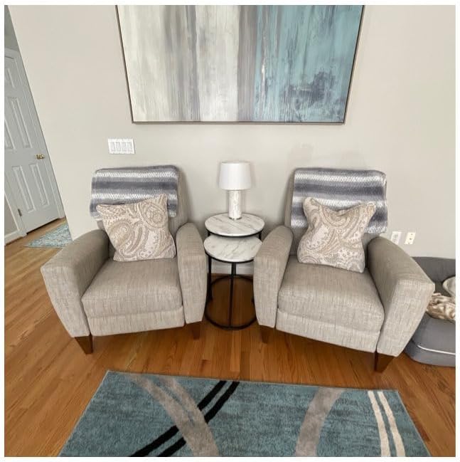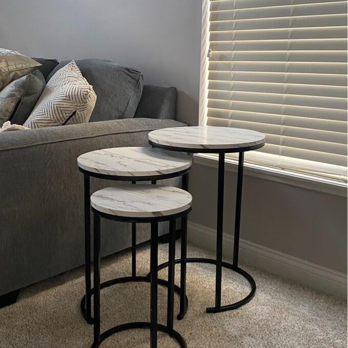 Bring contemporary charm to your home with the Living Room Table Set of 3. The clean lines of these tables are sure to bring an elegant vibe to your home. These round tables feature sleek black metal bases on the bottom with a black faux marble top and are constructed from sturdy manufactured wood material and metal. The side table set can be kept all together or used separately around the room for a consistent look. The easy-to-assemble living room table set is nestable by stacking the larger tables over top of the smaller tables to take up a minimal footprint, so they're the perfect addition to any room-especially in small homes, apartments, or dorms.