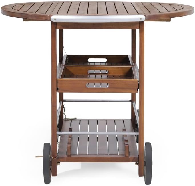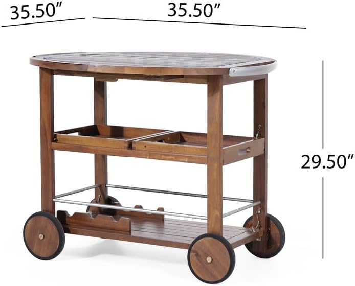 Key Features【Sturdy Acacia Wood Construction】Crafted from durable acacia wood, this outdoor bar cart provides a strong and stable surface for serving drinks and snacks.【Drop Leaf Counter for Extra Space】Features a convenient drop-leaf countertop that expands your workspace for entertaining guests outdoors and folds down when not in use.【Built-In Wine Rack & Two Drawers】Keep your beverages and bar essentials organized with a built-in wine rack and two spacious drawers for utensils, napkins, or cocktail accessories.【Easy Mobility】Aluminum handles on top and smooth-rolling wheels at the bottom allow you to effortlessly move the cart wherever it’s needed.【Stylish Outdoor Design】Finished in a rich Oak and Silver combination, this rolling bar cart complements any patio, deck, or outdoor space with a modern yet classic aesthetic.📏 Specifications● Overall Dimensions: 35.50"D × 35.50"W × 29.50"H● Product Weight: 40.79 lbs● Package Dimensions: 36.00"L × 19.50"W × 10.75"H● Package Weight: 46.94 lbs● Frame Material: Acacia Wood + Aluminum Accents● Color: Oak + Silver● Drop Leaf Countertop: Yes● Built-In Wine Rack: Yes● Number of Drawers: 2● Rolling Wheels: Yes● Country of Origin: Vietnam