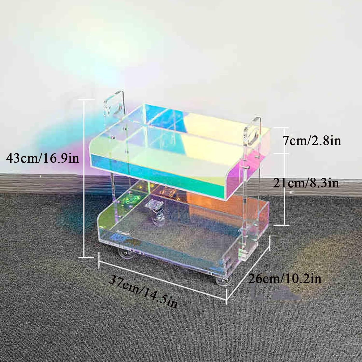 Elevate Your Space: Crafted from premium acrylic, this modern side table seamlessly blends with any contemporary decor. Its transparent construction adds a chic touch of sophistication to your living room, bedroom, or kitchen, enhancing the overall aesthetic of your home. Versatile Mobility: Featuring lockable wheels, this mobile end table is designed for convenience. Easily glide it to your preferred location, and secure it in place to ensure stability while you enjoy your favorite activities. Whether you need an extra surface for drinks while entertaining or a bedside table for nighttime essentials, this piece adapts to your needs. Ample Storage Solution: Struggling with clutter? This acrylic coffee table offers generous space for books, magazines, and remote controls. Keep your living area organized and stylish with this practical storage solution that not only beautifies your space but also provides functionality. Product Details: - Color: Colorful - Style: Modern - Shape: Rectangular - Material: Acrylic - Dimensions: - Total Size: 14.5"x10.2"x16.9" / 14.5"x10.2"x25.2" / 14.5"x10.2"x33.8" - Individual Shelf Size: 14.5"x10.2"x2.8" Included in the Package: - 1 Acrylic Storage Rolling Cart - All Necessary Hardware Please Note: - This listing includes only the product; decorative items are not included. - Manual measurements may result in a slight size variance of 1-2 cm. - Color discrepancies may occur due to lighting, environment, and monitor settings. Discover the perfect blend of style and functionality with our acrylic side table, designed to enhance your living experience.