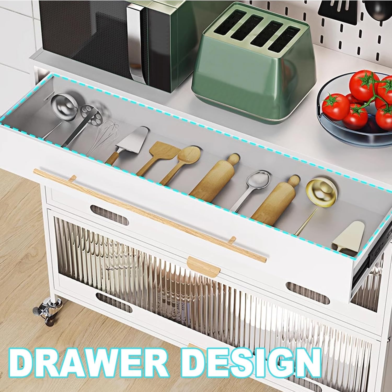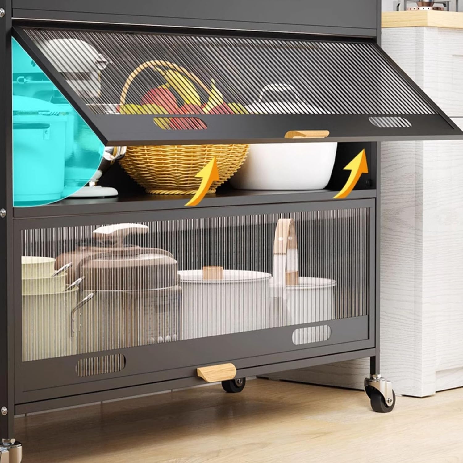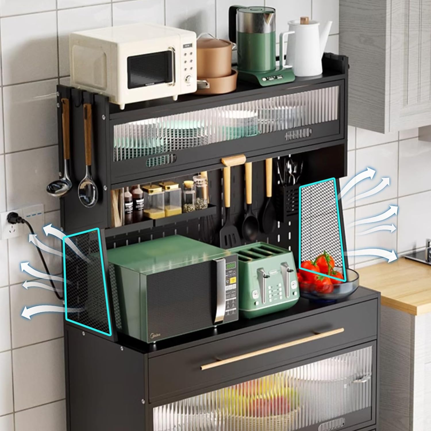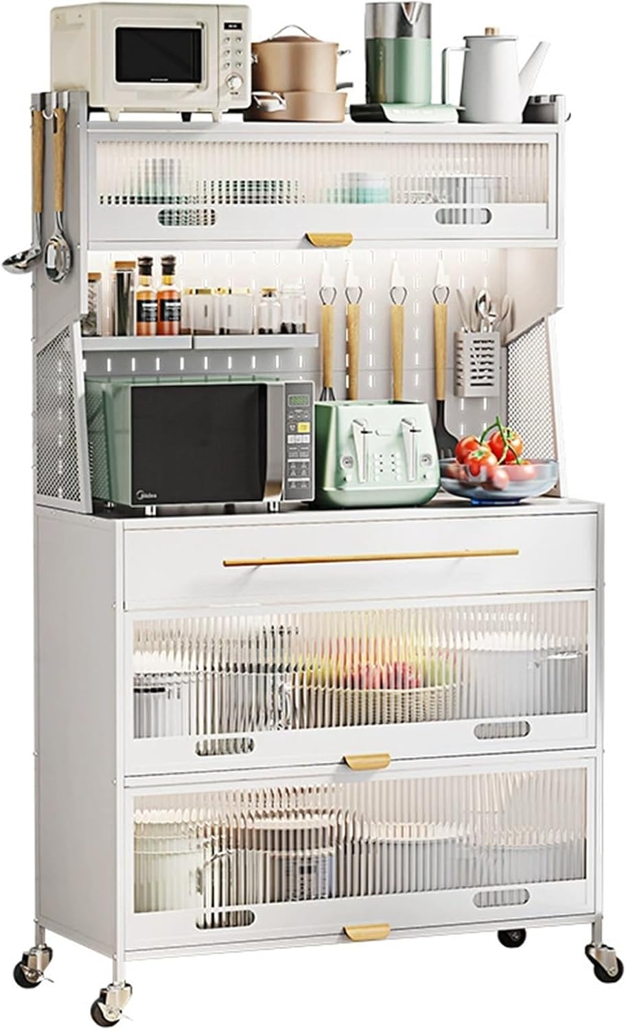 kitchen storage rack:Product Description: Name: Kitchen coffee bar cabinet with storage, kitchen stand metal kitchen storage cabinets, bakers rack with storage cabinet Material: Carbon steel Color: Black, White DIY installation required Package: Bakers rack (Set) x 1, 4 hooks on the cabinet side, 4 hooks on the perforated board, 4 non-slip rubber pads Note: We are manually measuring, there may be an error of 1-3cm, please prevail in kind.