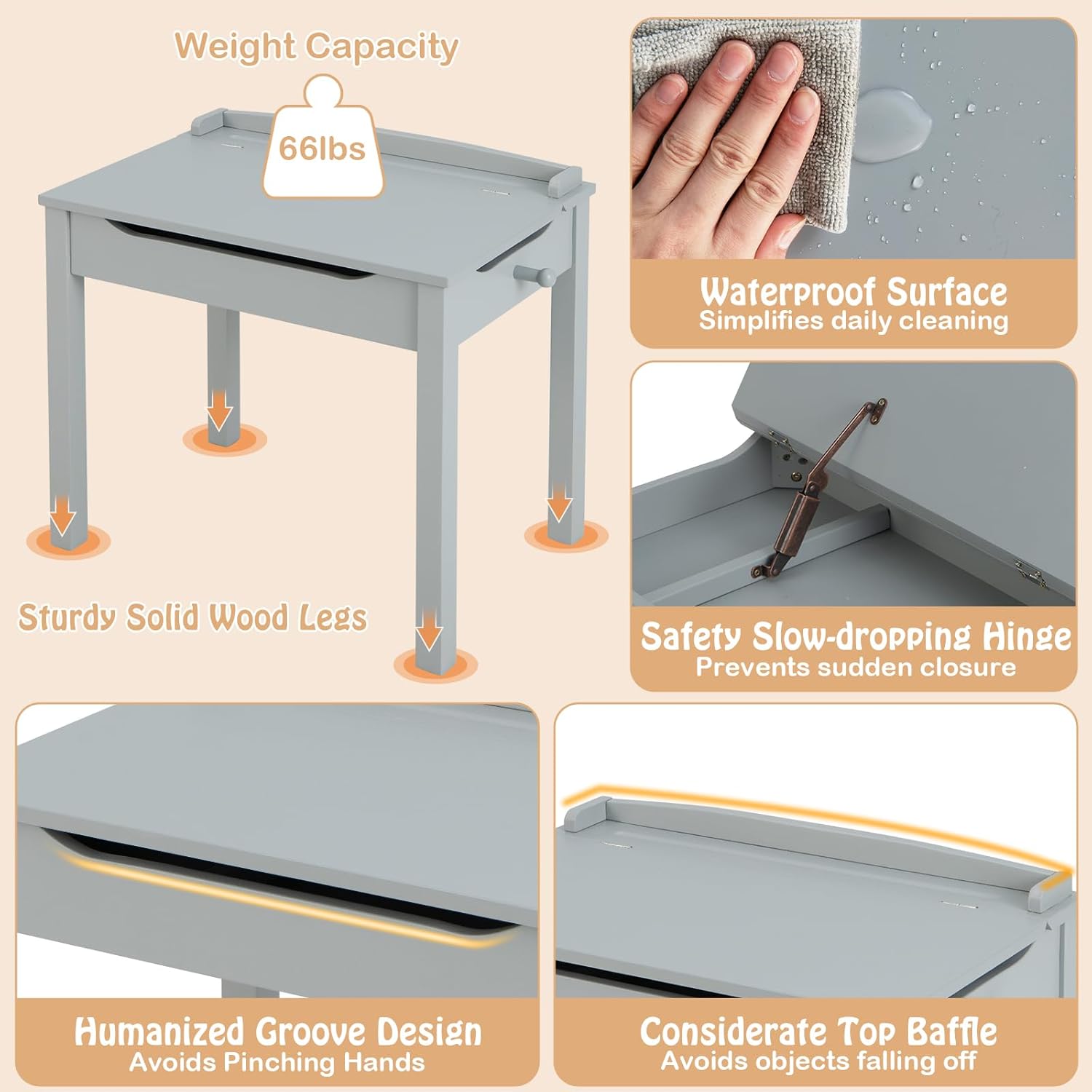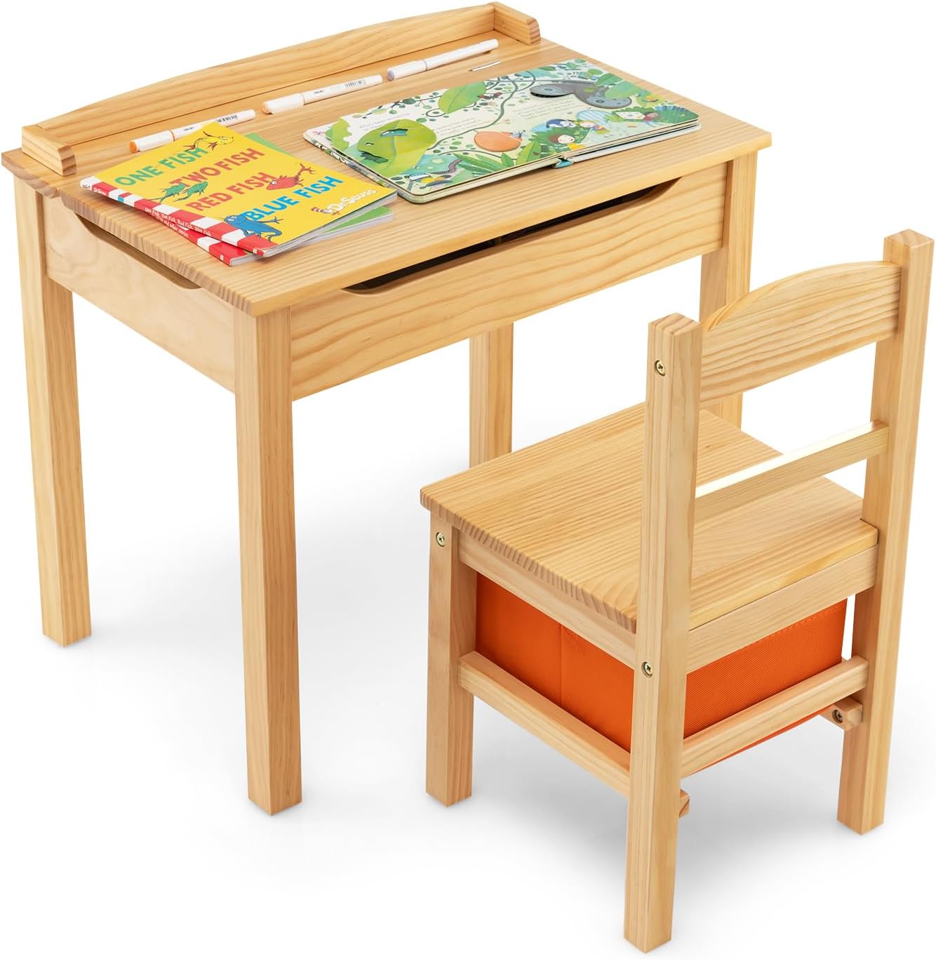 Description:Provide a great study space for your child with our kids’ lift-top table and chair set!This lift-top desk and chair set is made of selected solid wood and MDF, ensuring a long service time. In addition, there is ample storage space with a large tabletop, an internal storage space and a storage box. The lift-up tabletop is equipped with strong metal hinges for safety and flexibility. This wooden table and chair set can not only serve as a writing desk, but also act as a drawing table or playing table. Furthermore, the clear instruction renders installation simple. And daily maintenance appears easy with soft cloth.Features:Lift-up tabletop with ample inner storage space for perfect storage solutionLarge tabletop with top baffle and pen slots avoid objects falling offEquipped with a hook to hang kids' backpacks or water bottlesPull-out storage box with convenient handle for easy useSafety slow-dropping hinge can avoid sudden closureDesigned with humanized grooves to avoid pinching fingersIt can help kids develop a good habit of organizing thingsPremium solid wood and MDF materials promise a longer service timeSturdy chair with backrest for a cozy and secure sitting experienceASTM & CPSIA certifications add to reliabilityWaterproof and smooth surface simplifies daily cleaningIdeal for learning, drawing, playing, eating, etcDetailed and illustrated user’s manual for simple assemblySpecifications:Color: White/NaturalMaterial: Pine Wood, MDF, Non-woven FabricOverall Dimension of Table: 23" x 16" x 21.5" (L x W x H)Overall Dimension of Chair: 12" x 12" x 22.5" (L x W x H)Size of Storage Box: 10" x 8.5" x 4.5" (L x W x H)Size of Tabletop: 23" x 16" (L x W)Size of Seat: 12" x 12" (L x W)Seat Height from the Ground: 12"Net Weight: 17.5 lbsWeight Capacity of Table: 66 lbsWeight Capacity of Chair: 154 lbsRecommended Ages: 3+ Years OldPackage Includes:1 x Table1 x Chair1 x Instruction