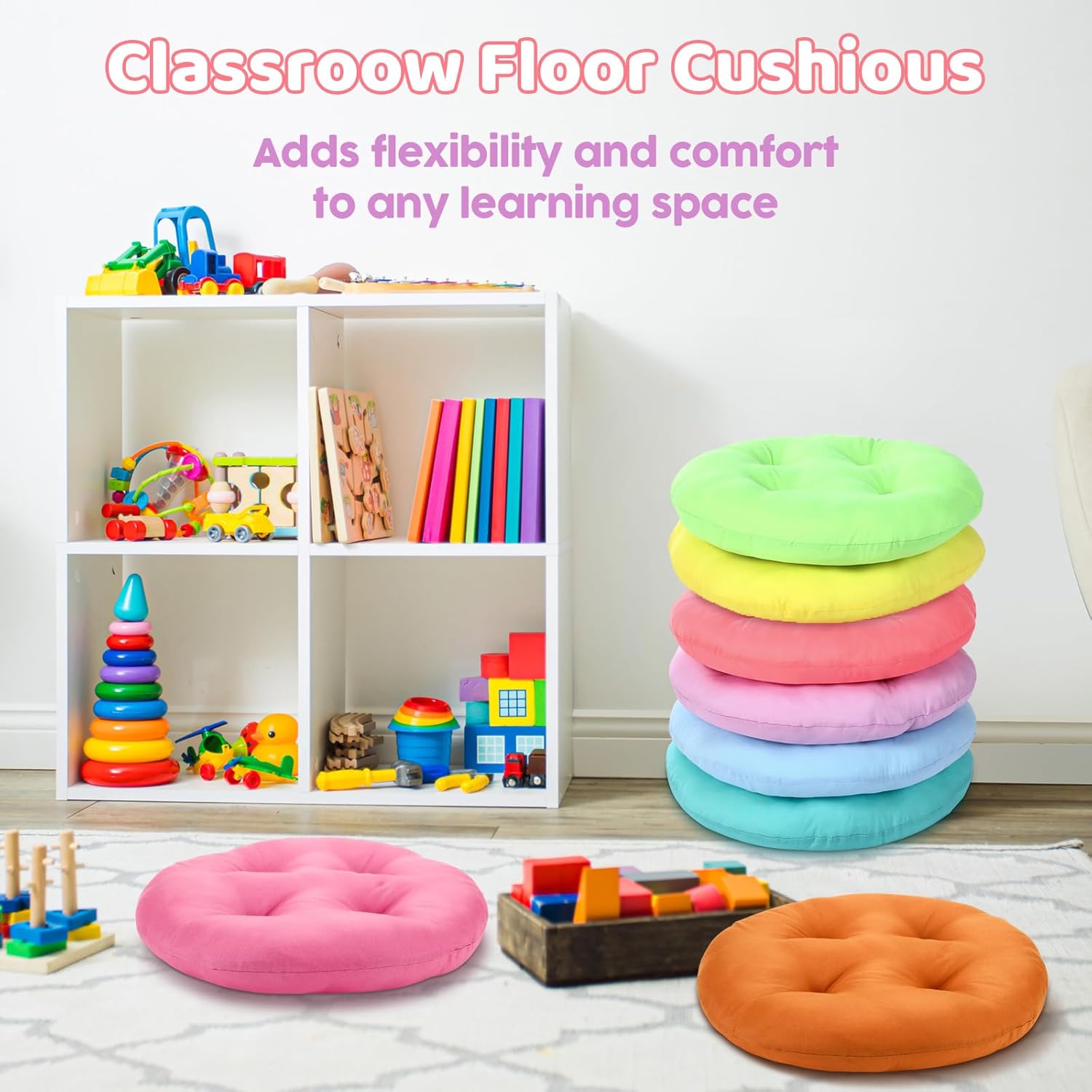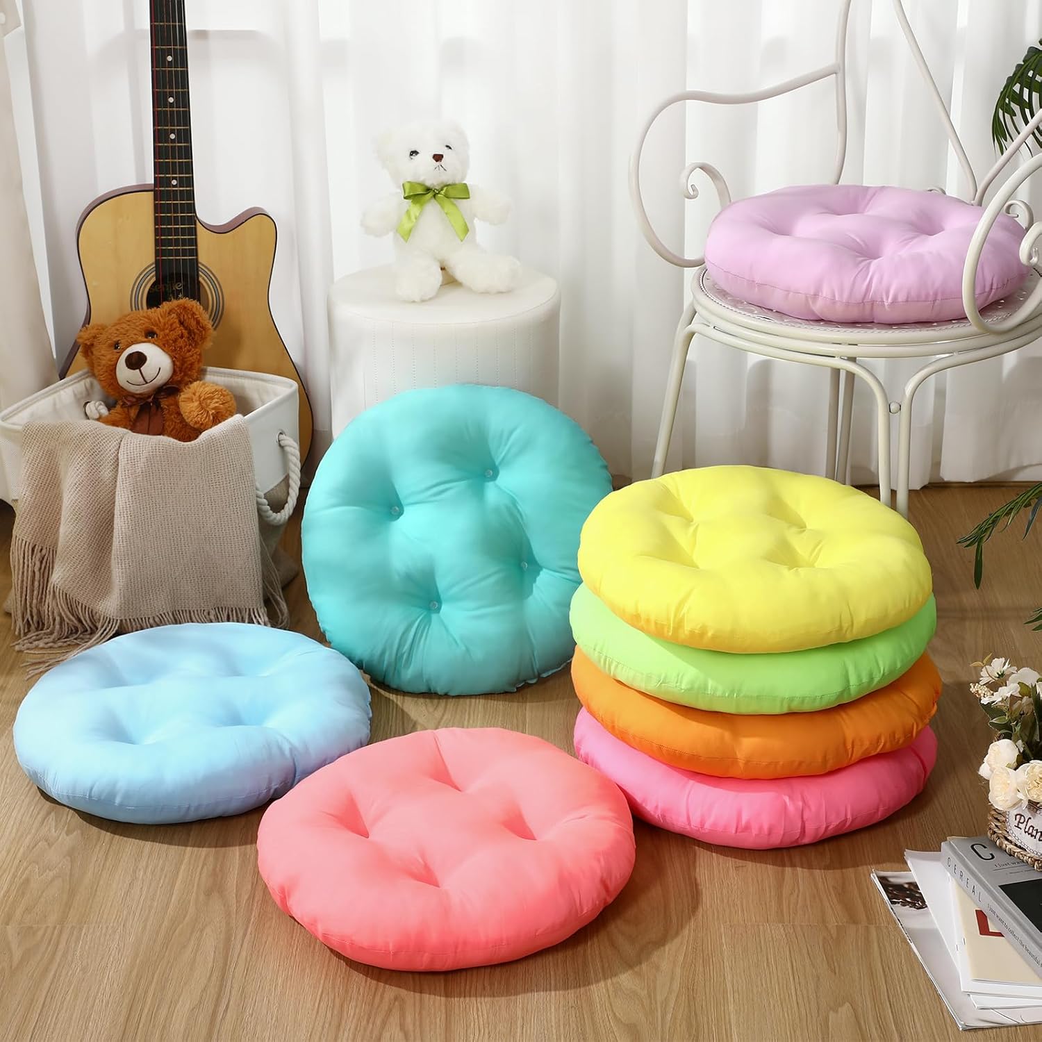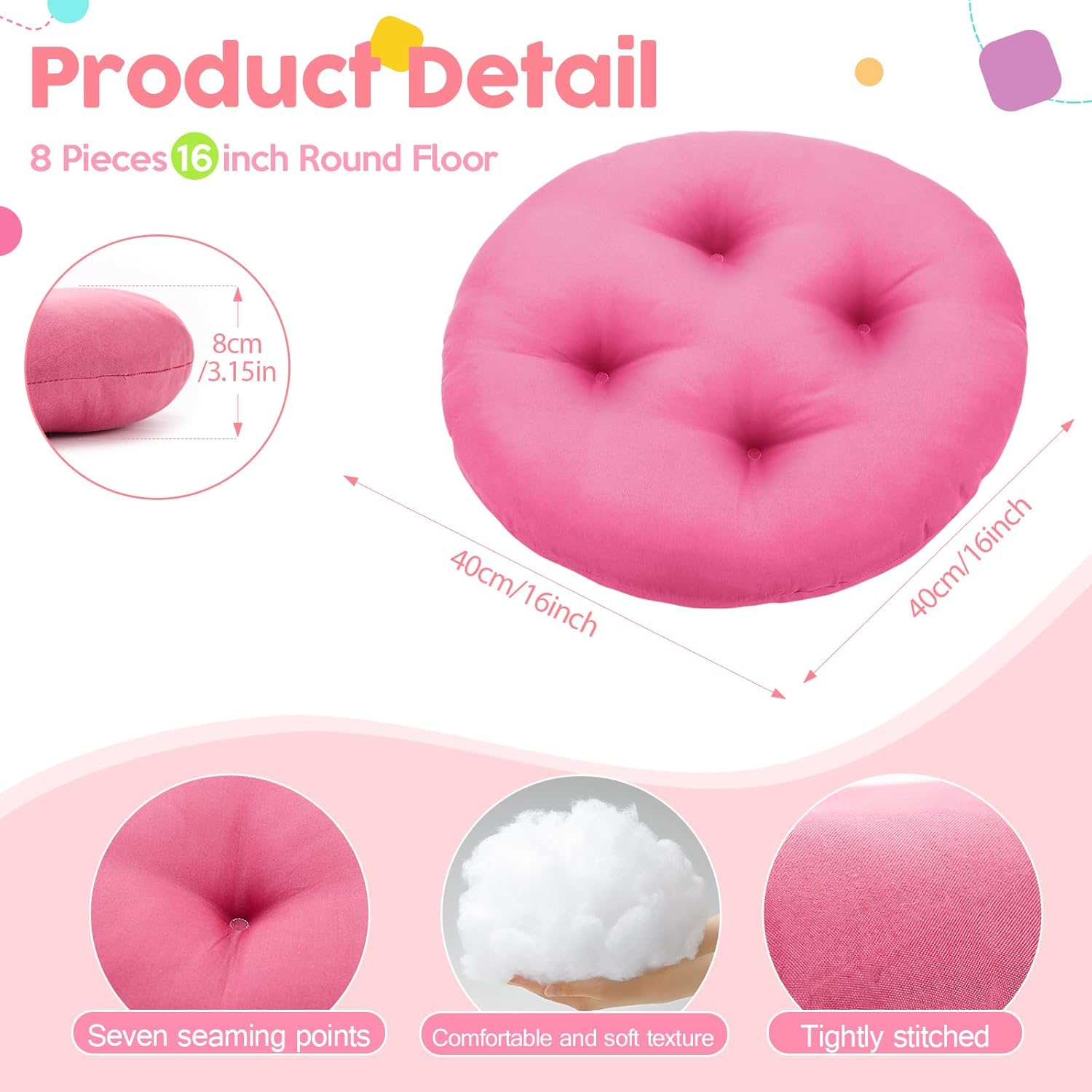 Features: Colorful to inspire creativity: These children's floor cushions come in a variety of colors to add vitality to children's study and play Spaces. Whether it's creating a cozy reading corner or for group discussions in class, this cushion creates a relaxed and enjoyable atmosphere that stimulates creativity and focus, allowing children to explore and grow freely in a comfortable environment. Specifications: Material: polyester fiber, PP cotton Color: bright color Size: 40 X 40 x 8 cm /16 x 16 x 3.15 inches Package includes: 8 x Kids floor cushions Notes: Manual measurement, please allow slight errors on size. The color may exist a slight difference due to different screen displays.