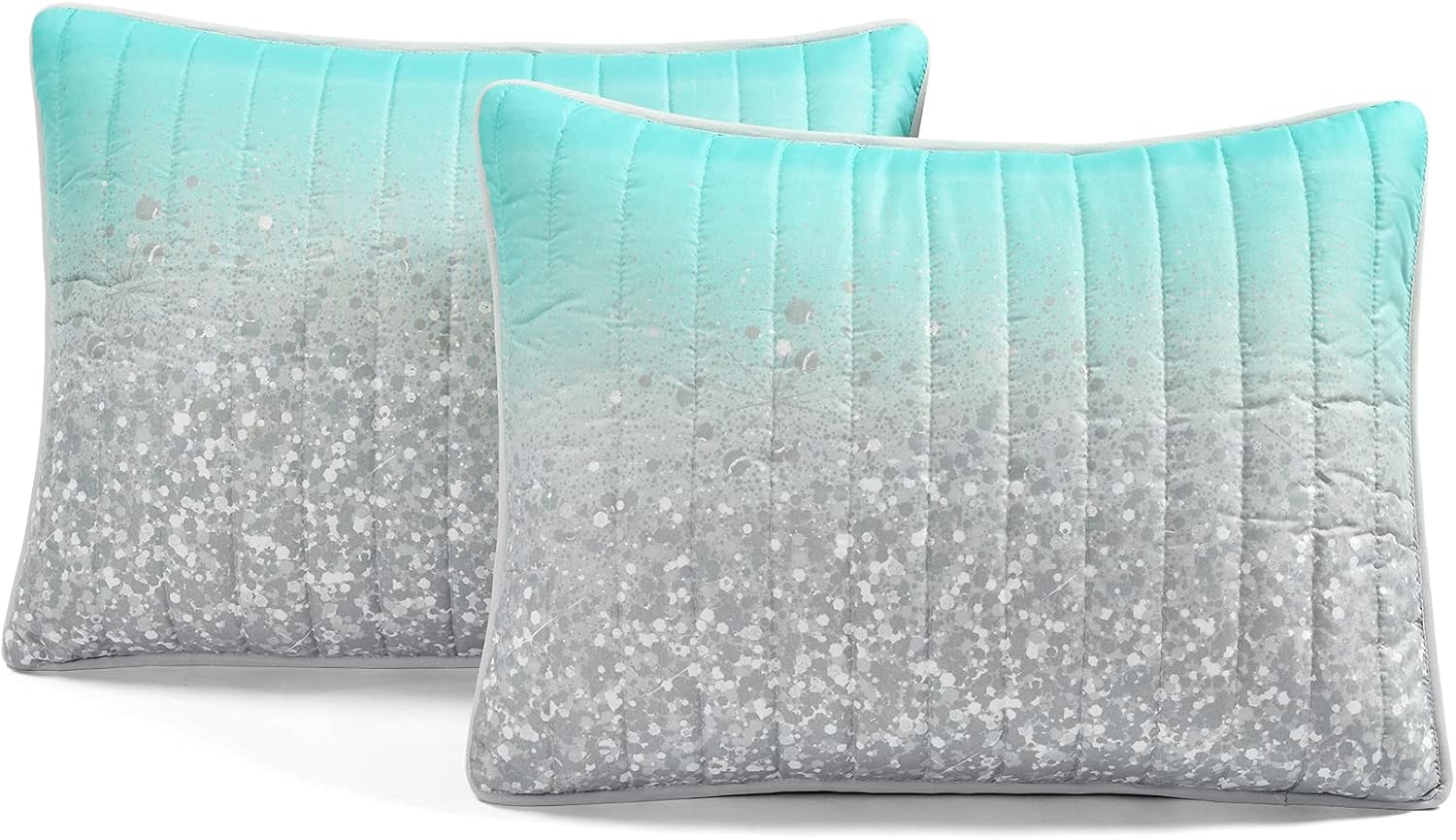 Give your child or teen's bedroom a glamorous makeover with the Lush Decor Glitter Ombre Metallic Print Quilt Set. Featuring a metallic glitter print that flows into a colorful ombre design, this kids bedding is sure to make a statement. You can never go wrong with glitter! The glitter ombre drips into a bright color and is a great way to introduce a pop of color into your kids bedroom decor. Available in twin and full/queen sizes. This glitter bedding set includes 1 quilt, 1 or 2 pillow shams and 1 or 2 pillowcases. The pillowcases are a solid gray color to match the set. Crafted from a soft microfiber fabric, this kids quilt set offers softness and comfort. The lightweight polyfill filling is perfect for any season, and even makes this a great layering piece. To care for this kids bedding set, simply machine wash cold on the gentle cycle and tumble dry low. Do no bleach. Use a steamer to release wrinkles, if needed.