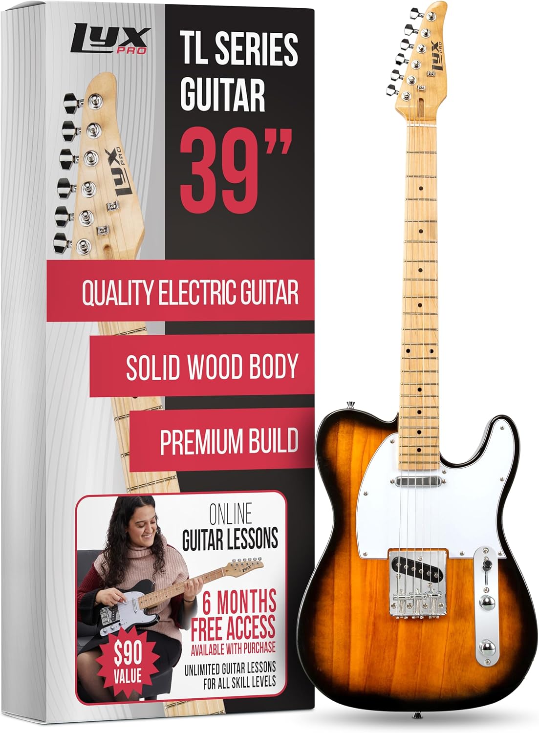 All the twang of the legendary Vintage Electric GuitarTransport to a bygone era of rock royalty with this stunning 30” Guitar from LyxPro.Featuring all the traditional qualities of the beloved Original style, this popular model is beloved by beginner, intermediate, and advanced players the world over.With its sturdy Paulownia wood body, comfortable C-shaped maple neck, vintage-style bridge, and other throwback accents, this impressive instrument melds classic style with unsurpassed LyxPro sound quality.A handcrafted fretboard makes picking a pleasure, while an advanced 3-way switch, tone, and volume knobs allow for seamless intonation and audio control.Just plug in, grab a pick [two included]—and discover the LyxPro difference! Add a 30” Electric Guitar to your cart today.What You Get1 x 30” Electric Guitar2 x Guitar PicksUser GuideSpecs & DetailsBody: single cut, PaulowniaNeck: C-shape, mapleTuners: sealed-gear pegsFrets: 22Bridge: 3-saddle, ashtrayPickup: 3-way selectorAUX port: yes