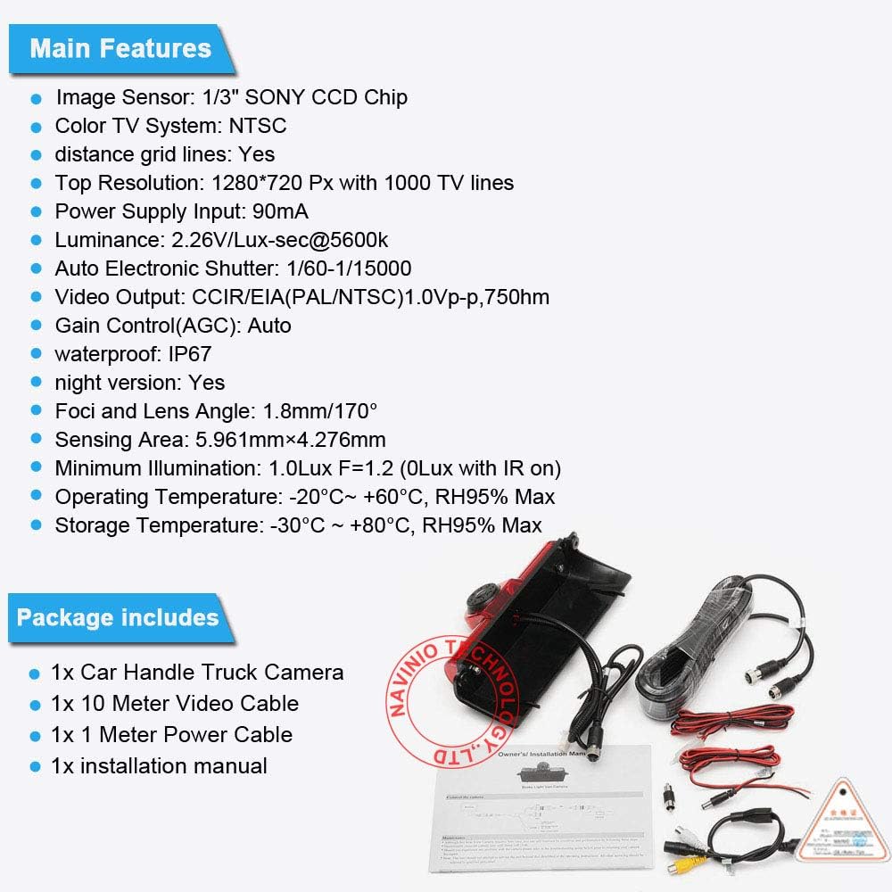 Dear customer,Please must check the camera size and appearance before place a order, see if can fit your car brake light lamp place size and appearance! Because the same car model in different countries may have some difference,please check the camera size and compare the installation of your car carefully to avoid mistake. This product could fit for all below models as expected:For Express GMC SAVANA VANS Exporer Vans Cargo- Image sensor: 1/3 inch Color CCD- Viewing angle: 160 degrees- TV system: NTSC standard and if need PAL, please leave a message- Effective pixels: 628 x 586 Pixels- Resolution: 520 TV lines- Power supply: DC 12V- Waterproof: IP67- Working temperature: -40~ 70℃/ -40~ 158℉Package Contents1 x Car Rear view Camera1 x Power Cable (1.5m/4.9ft) 1 x AV Cable (8m) 1 x User Manual