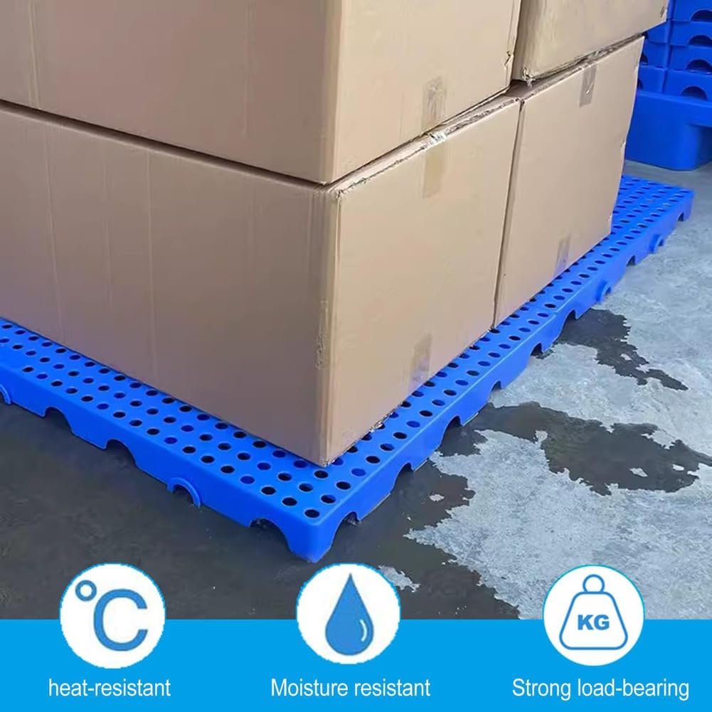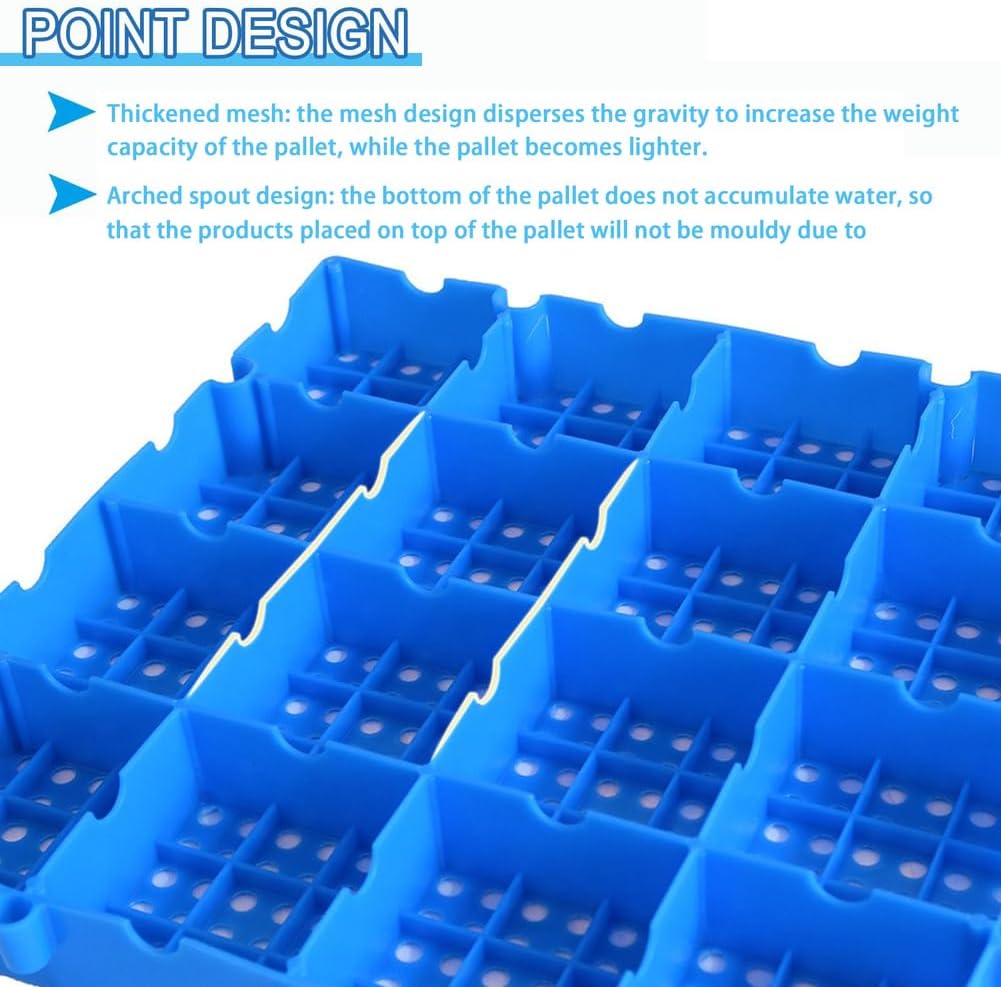 The blue hue of the commercial pallet is not only practical and easy to clean, but also aesthetically pleasing. Even after long-term use, its color remains bright and vivid, adding visual appeal to the storage environment.Specifications:Material: HDPEColor: blueSize: 40 x 40 x 5cm/15.75 x 15.75 x 1.96in50 x 50 x 5cm/19.68 x 19.86 x 1.96inFeatures:Polyethylene material: durable and moisture-proof.Lightweight design: easy to carry and stack.Adapt to various climates: withstand all weather conditions.Easy to clean: keep hygiene and easy maintenance.Bright colors: beautiful and durable.Keep dry: suitable for warehouses, supermarkets, etc., to ensure that items are dry and ventilated.Package includes:4 x Plastic palletNotes:Manual measurement, please allow slight errors on size.The color may exist a slight difference due to different screen displays.