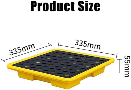 The spill containment platform is designed to securely hold various types of drums including oil, paint, chemical liquids, and water. Ideal for a wide range of environments such as maintenance shops, factories, workshops, warehouses, laboratories, and farms, this platform ensures safety and cleanliness by preventing leaks. Made from high-quality polyethylene, it features a durable, thickened design with rounded corners for enhanced safety and resistance to pressure. The platform is reusable, offering versatility for storage needs, from daily groceries and home toys to warehouse and supermarket goods. Its large storage space at the bottom effectively contains any leaks, providing peace of mind. Available in multiple sizes to suit different requirements, each platform is color-coded in yellow and black for easy identification. The product comes with detailed specifications for size, leakage volume, and load capacity to help you choose the right fit for your needs. Included in the package is one spill containment tray, ready for immediate use. Please note, slight variations in color may occur due to monitor and lighting differences, and a small measurement error is possible due to manual sizing.