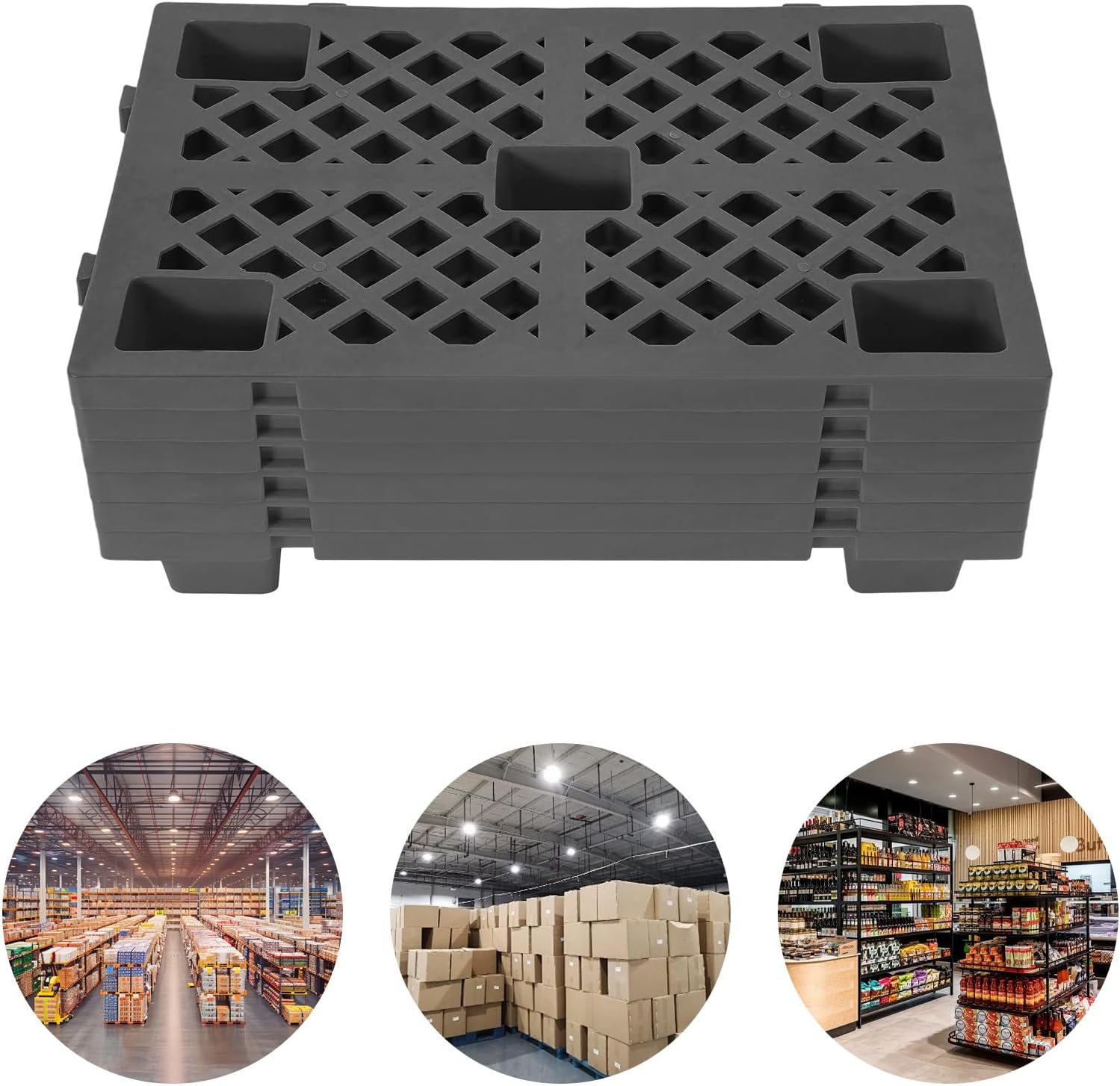 DescriptionThe 6 pcs pallets are a versatile and reliable solution for modern logistics and storage needs. Their interlocking and stackable design, combined with a high load capacity, ensures efficiency and durability in demanding environments. Whether in warehouses, factories, or specialized industrial settings, these pallets deliver unmatched performance and adaptability.DetailsSmooth Edge: It can protect you from potential cuts or scrapes and prevent accidental damage to the goods during use.Multi Support Feet: This design can effectively disperse the weight of the loaded goods, and enhance the load-bearing capacity and stability of the product.Mesh-shaped Panel: The hollow-out structure enables excellent ventilation beneath the goods, preventing issues like mildew caused by moisture. ApplicationIt is suitable for warehouses, factories, logistics centers, storage facilities, food processing plants, agricultural settings, retail distribution centers, etc.SpecificationMaterial: HDPE, PPProcess: Injection MoldingColor: BlackShape: Rectangular Each Pallet Load Capacity: 100kg/220.46lbs Package Size: 64*43*27cm/25.2*16.93*10.63in Each Pallet Size: 60*40*10cm/23.62*15.75*3.94inGross Weight: 8.9kg/19.62lbsNet Weight: 8.46kg/18.65lbsPackage Included6* PalletsNotes1.Please check the product size carefully before purchasing.2.Please note that the package does not include other items.3.Forklifts and hydraulic trucks can not generally be used with this product, but only under specific working conditions. For example, when the pallets are spliced together and have flat-placed cargo on top. Using them in other improper situations may cause damage to the product or pose safety risks.