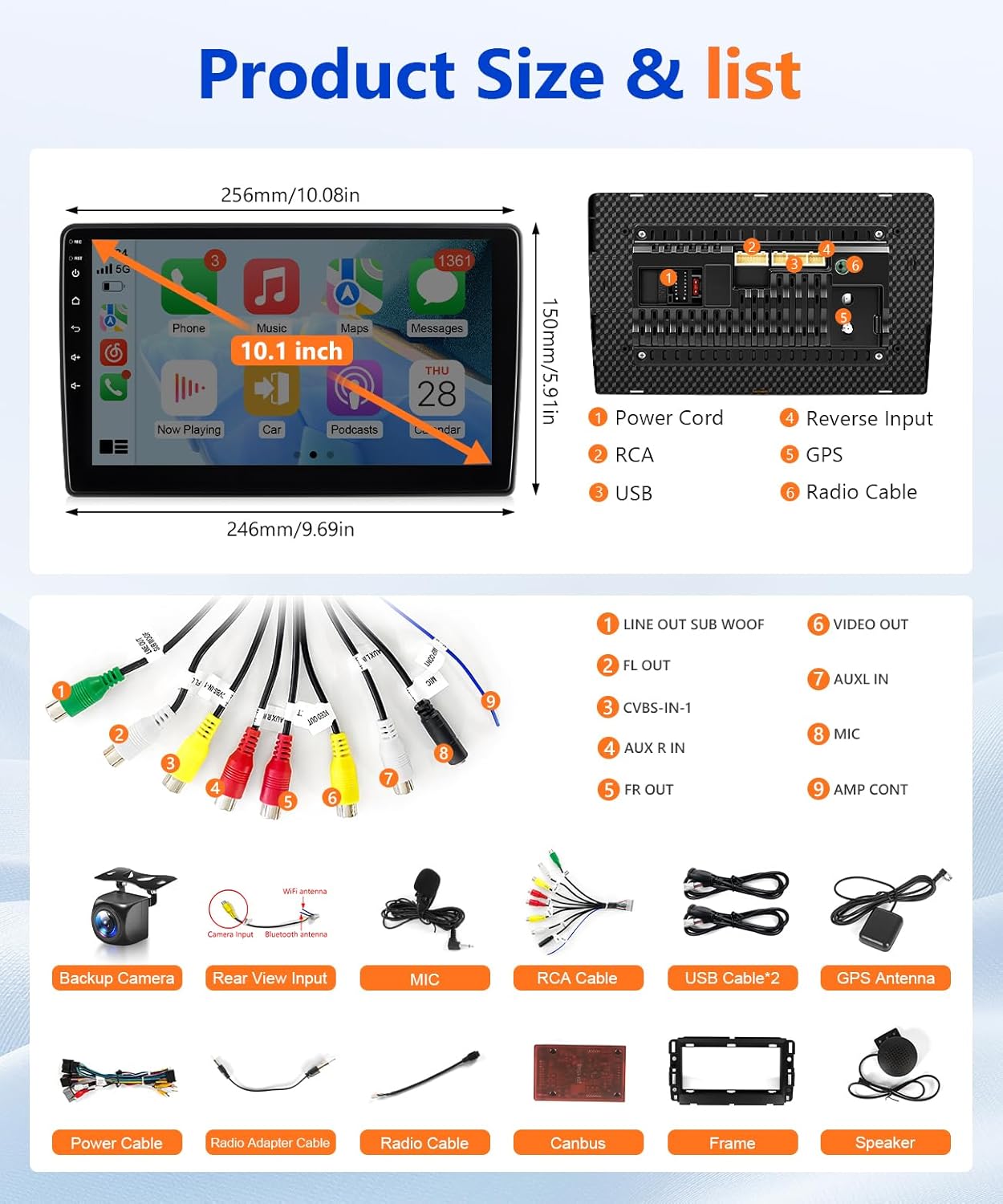 | BuiltIn Media | 10.1 inch IPS Touchscreen Android Radio Headunit, GPS Antenna, Full RCA Cable, 2 USB Cable, External Microphone, Installation Diagram and English User's Manual, Plug and Play Power Harness, 1080P Back-up Camera, Reversing Camera Input Cable |