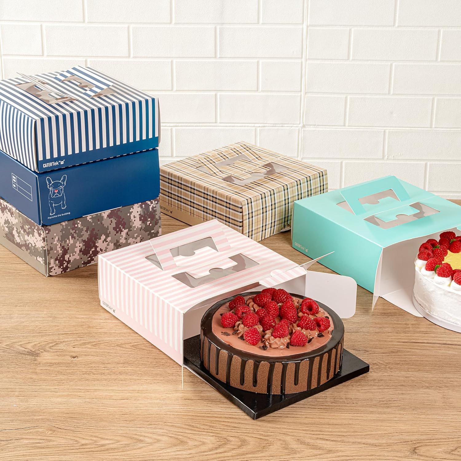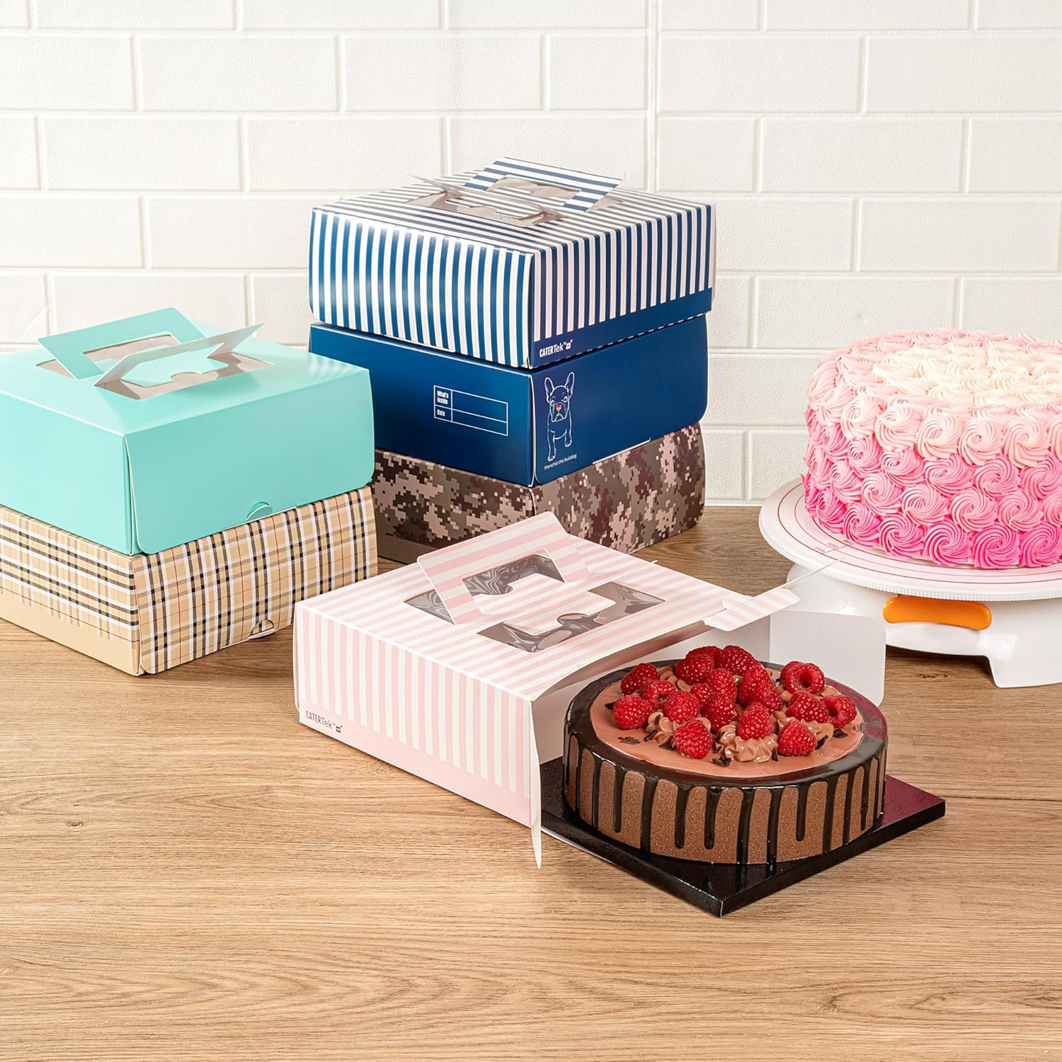 Add a touch of charm to your lunch or dessert orders with our Cater Tek Square Pink and White Stripe Paper Cake / Lunch Box. Constructed from durable paper, these disposable lunch containers hold heavy meals and desserts with ease. The convenient pop-up handles of these catering boxes provide a secure grip for employees while transporting orders. These cake boxes have built-in window display that enables swift identification without opening the box. The grease-impermeable coating of these paper pie boxes ensures buttery frosting or oily dishes are contained and without any mess. These disposable cake boxes have delightful pink and white stripes that lends an elegant touch to your pre packaged goods. For space-saving storage, these striped cake boxes are shipped flat and can be easily assembled. These paper lunch boxes measure measures 9 inches in length by 9 inches in width by 3.5 inches in height. Sold in a 50 count box.